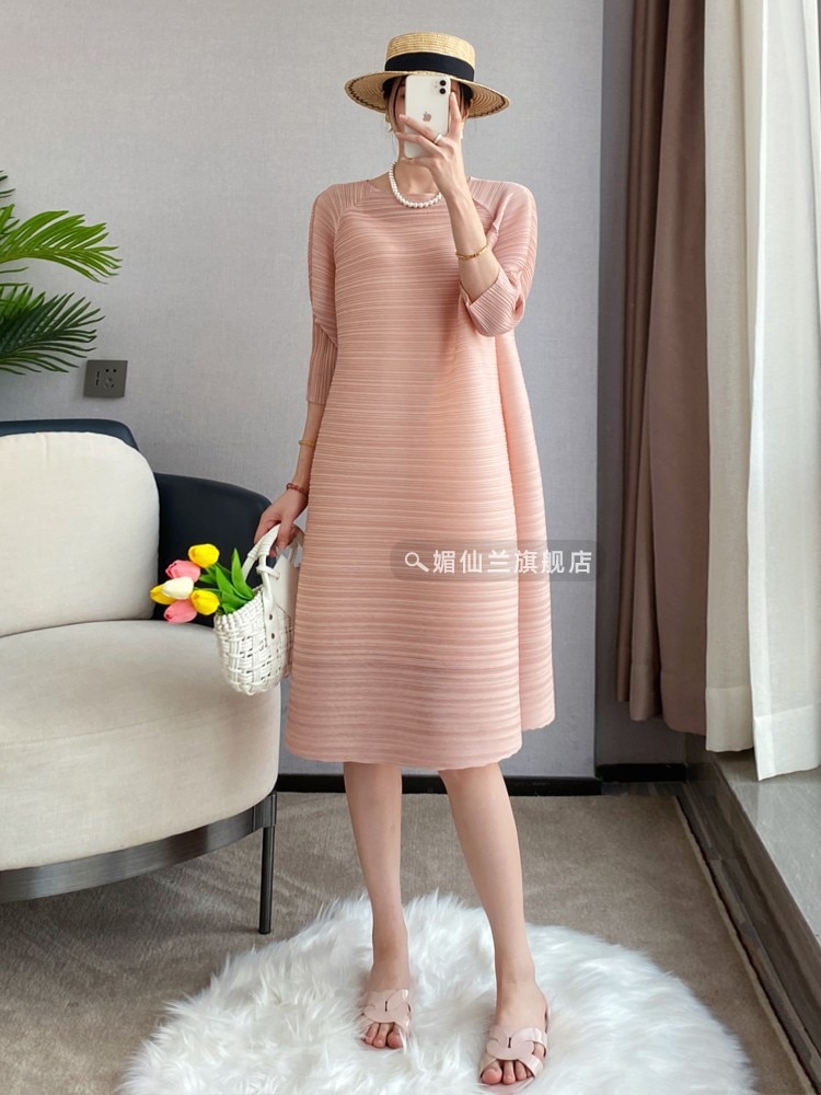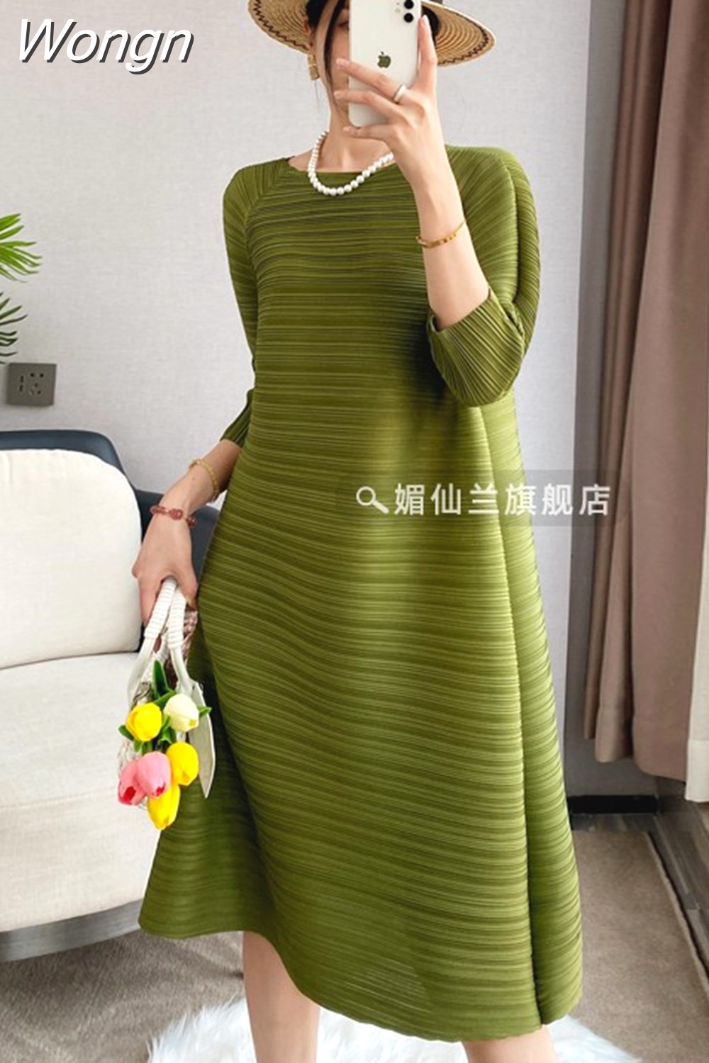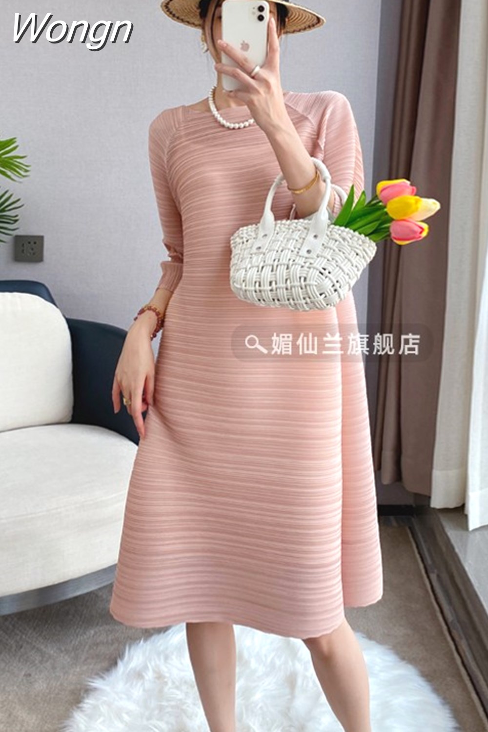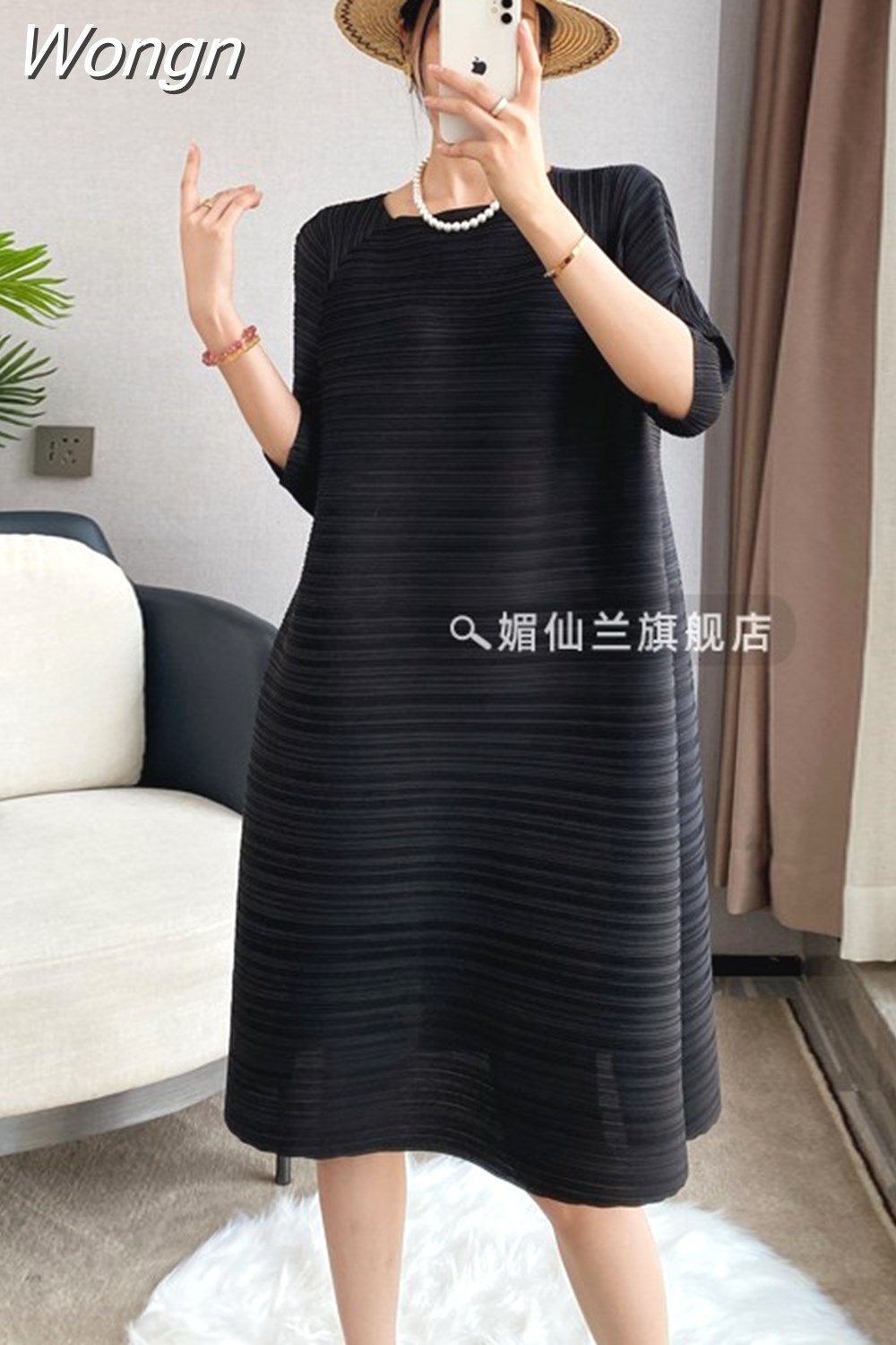 Wongn Pleated Dress Loose Covering Belly Large Size Elegant Party Dresses for Women Spring Summer 2023 New Skirt Robe