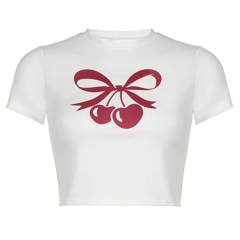 Wongn And Lovely Cherry Bow Printed Round Collar Basic T-Shirt Girls Wear A New Style Of Simple Blouse In Summer