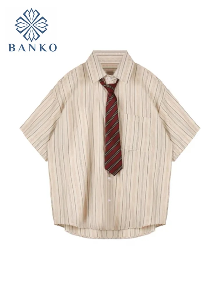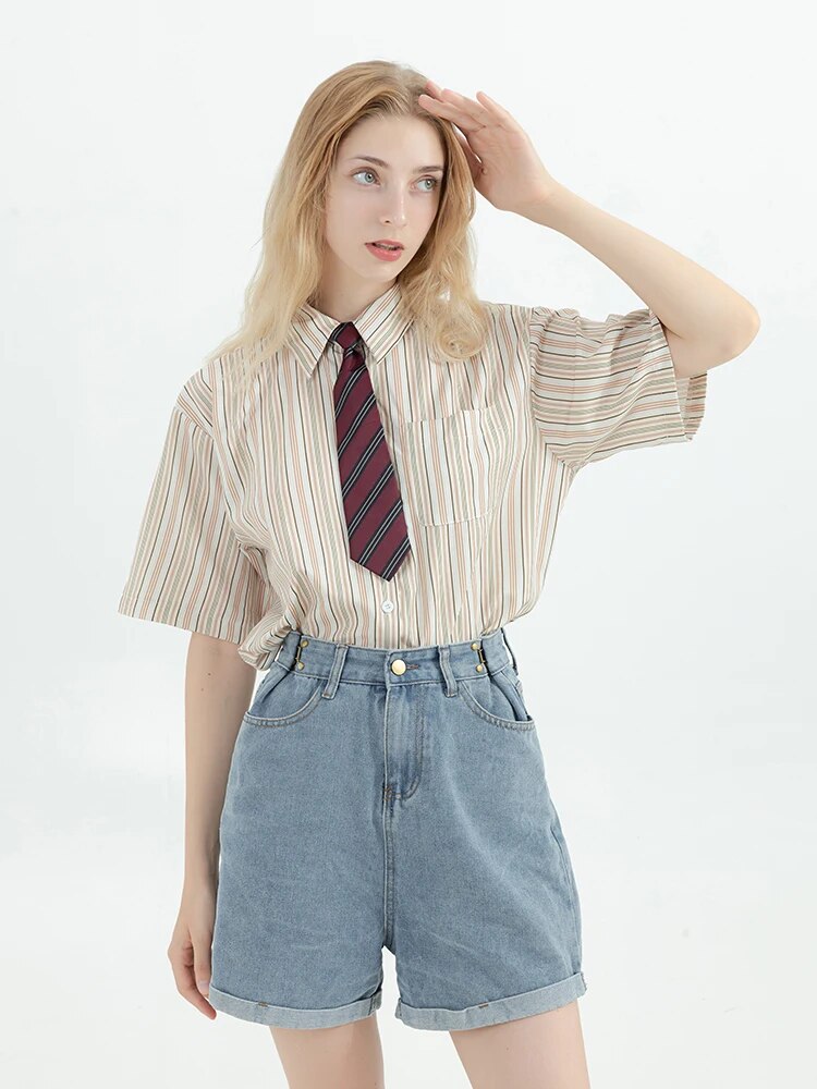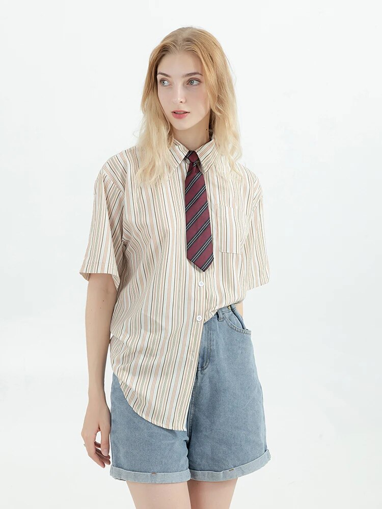 Wongn Preppy Style Stripe Shirt With Tie Women Korean Chic Short Sleeve Y2k All-Match Tops Vintage Harajuku Girl Blouse Clothes