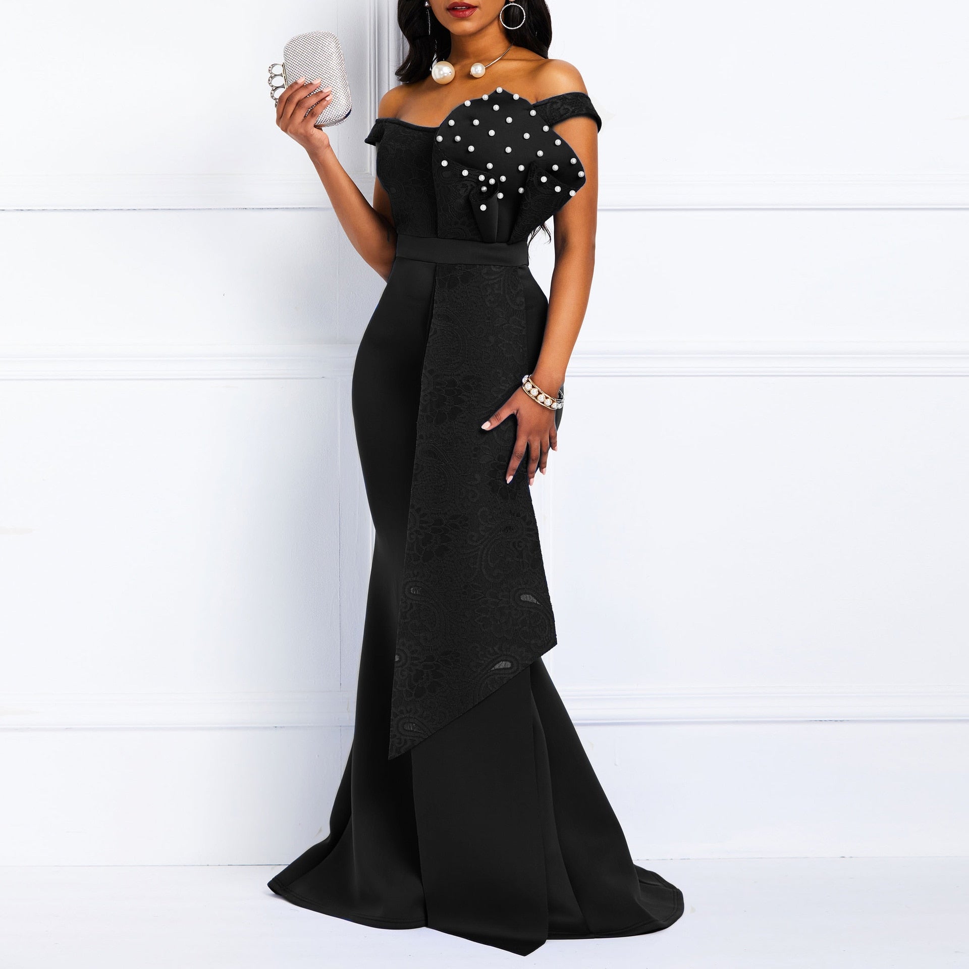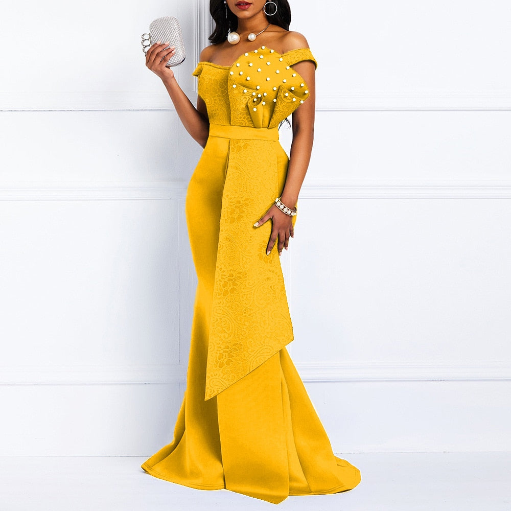 2021 Winter Women Slash Neck Short Sleeve Pearl Dress Sexy Office Lady Africa Evening Night Club Party Long Maxi Dresses GL05143