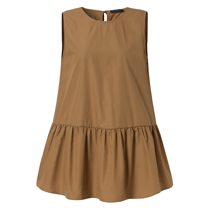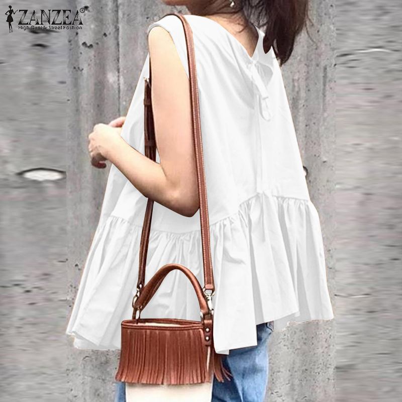 2022 ZANZEA Summer Fashion Sleeveless Blouse O Neck Ruffles Shirt Solid Baggy Vintage Tops Femme Blusa Lace Up Chemise