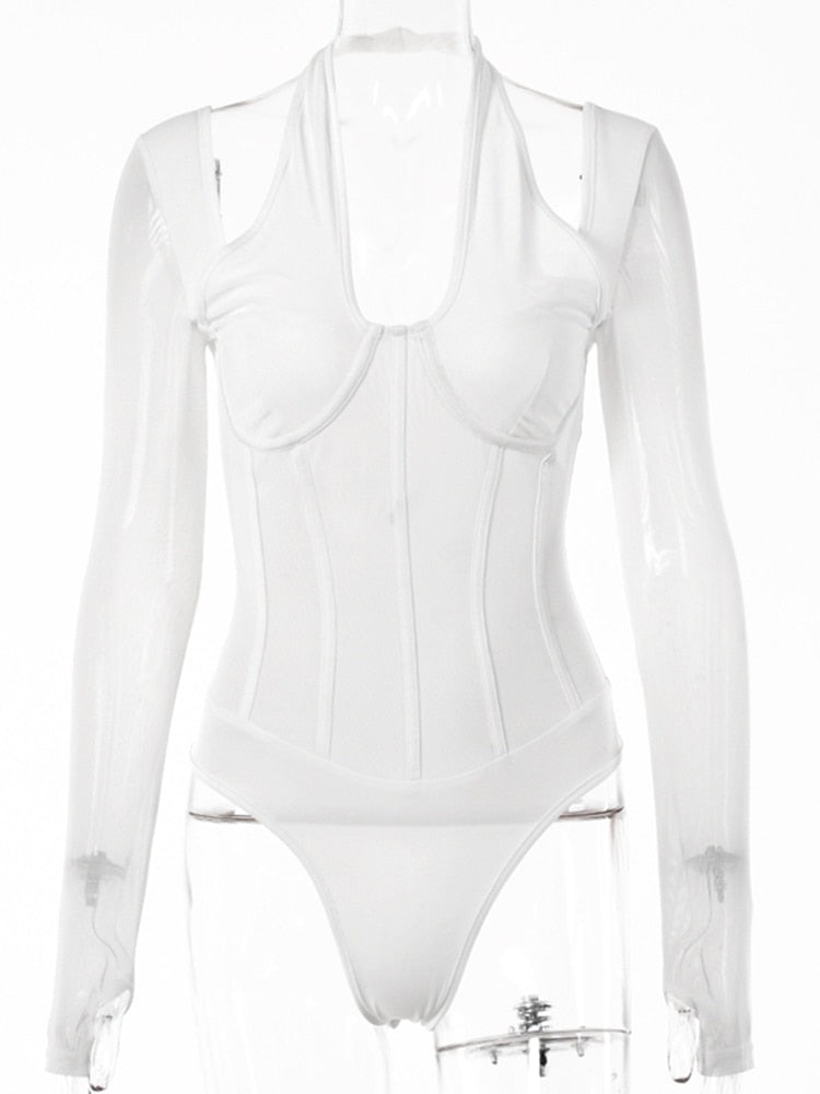 Articat Mesh See Through Slim Bodysuit Women Long Sleeve High Waist Sexy Bodycon Hollow Out Cross Collar Female Bodysuits