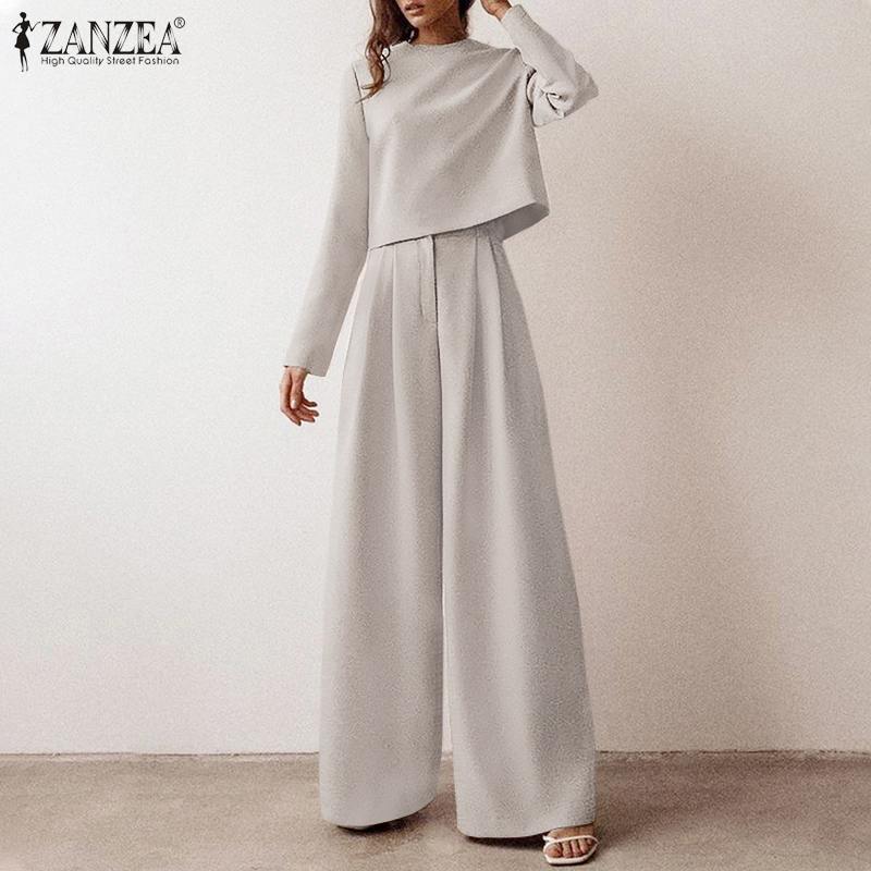 Autumn Women Casual Solid Matching Sets ZANZEA Elegant Long Sleeve Blouse Wide Leg Pant 2PCS Oversize High Waist Pant Sets Femme