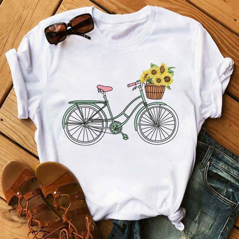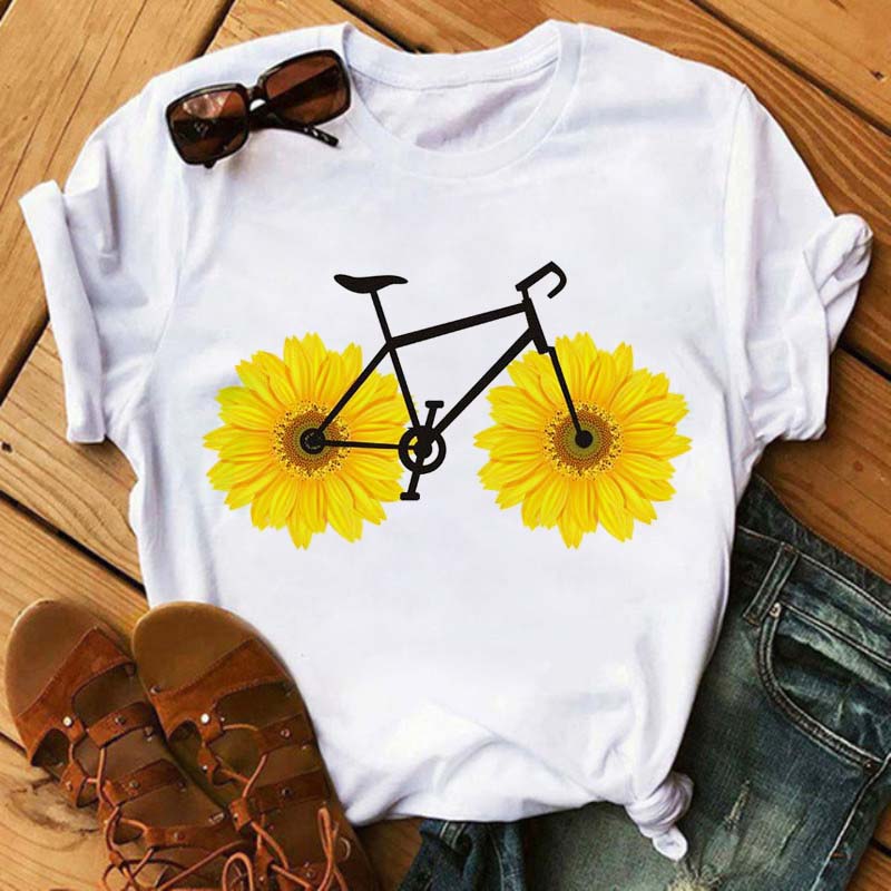 Bicycle with Sunflower Women Tshirt Summer Harajuku Short Sleeve White T Shirts Cartoon Casual Woman Tops Tees