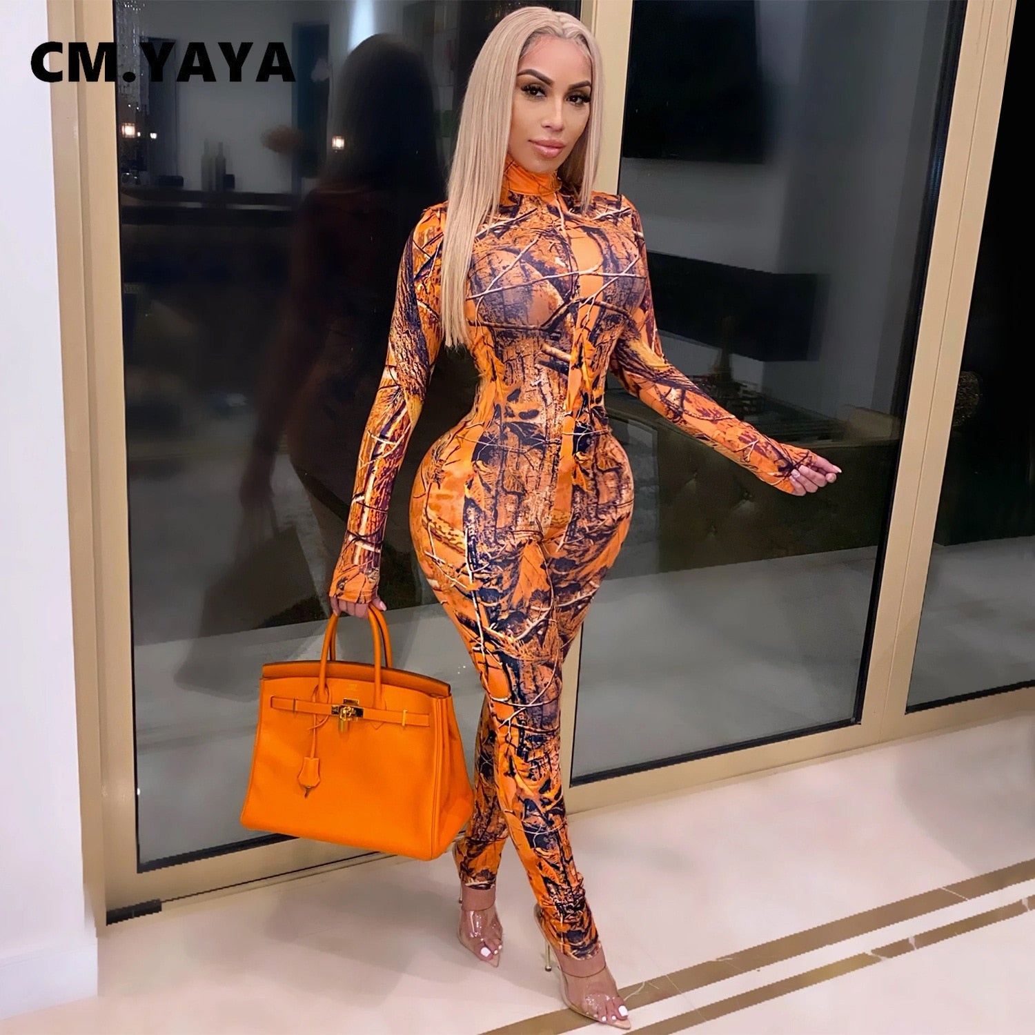 CM.YAYA Active Tie Dye Letter Print Turtleneck Bodycon Jumpsuit for Women Sexy Club One Piece Overall Bodycon Rompers Outfits