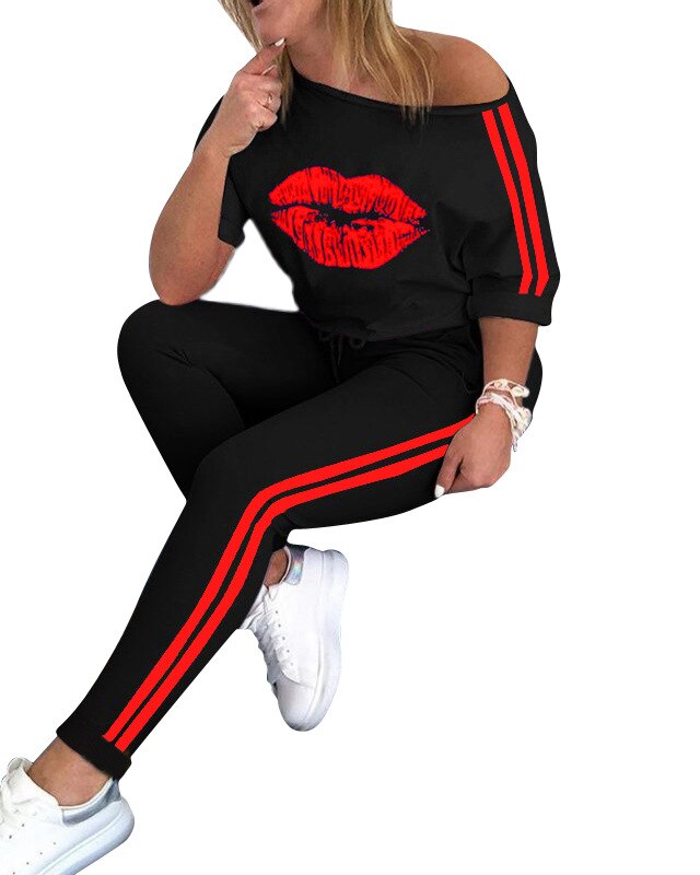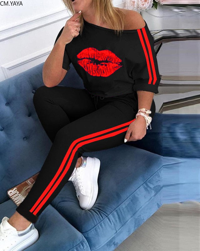 CM.YAYA Autumn Sport Lips Print Tops Striped Women's Set Jogger Pants Suit Active Wear Tracksuit Two Piece Set Fitness Outfit