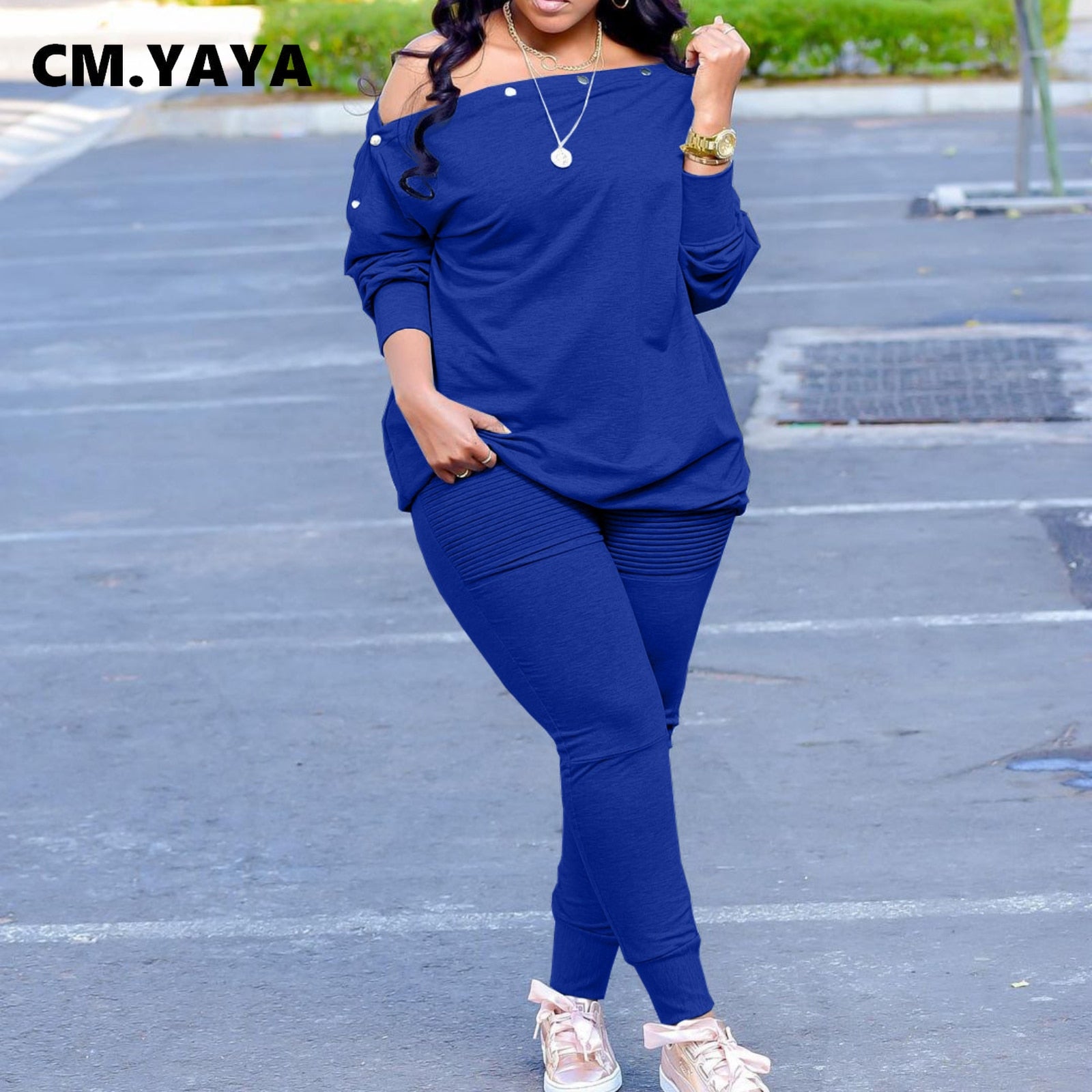 CM.YAYA Autumn Winter Elegant Women's Set Button Up Slash Neck Tops and Draped Pants Tracksuit Two Piece Set Fitness Outfits