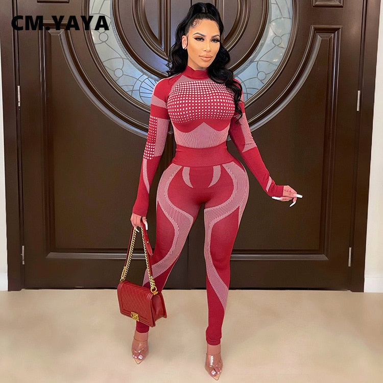 CM.YAYA Autumn Women's Set Long Sleeve T-shirt and Legging Sweatsuit Sport Tracksuit Two Piece Set Fitness Outfits Gym Yoga Suit