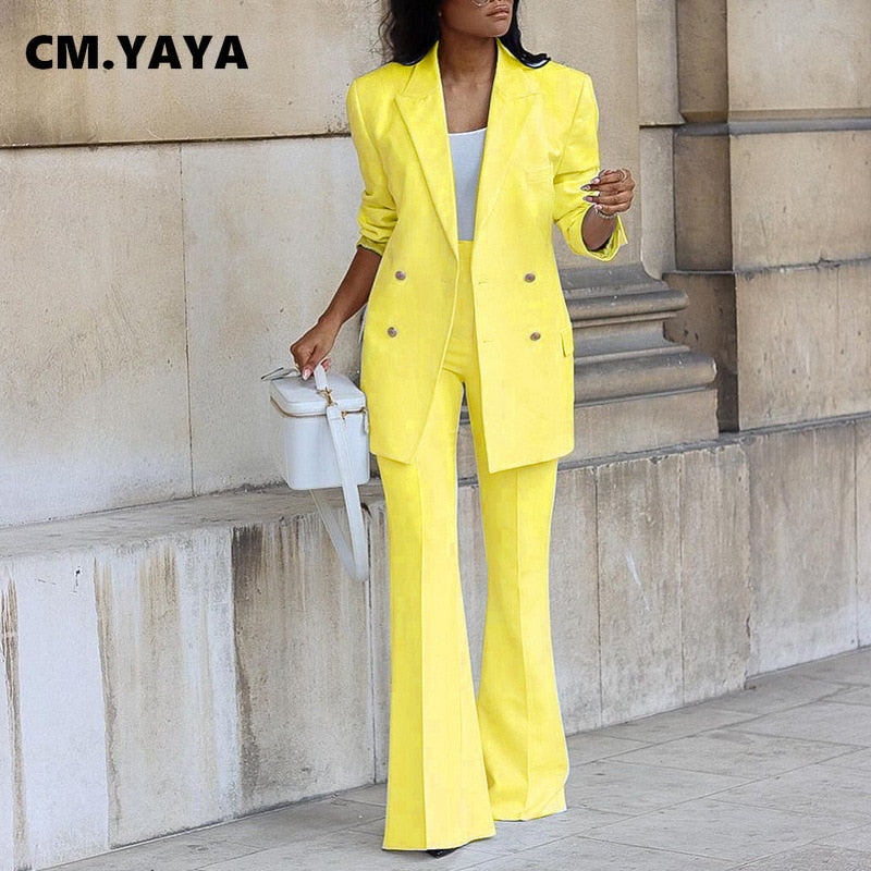 CM.YAYA Basic Elegant Women's Tracksuit Double Breasted Blazers and Straight Flare Pants Suit Matching Two 2 Piece Set Outfits