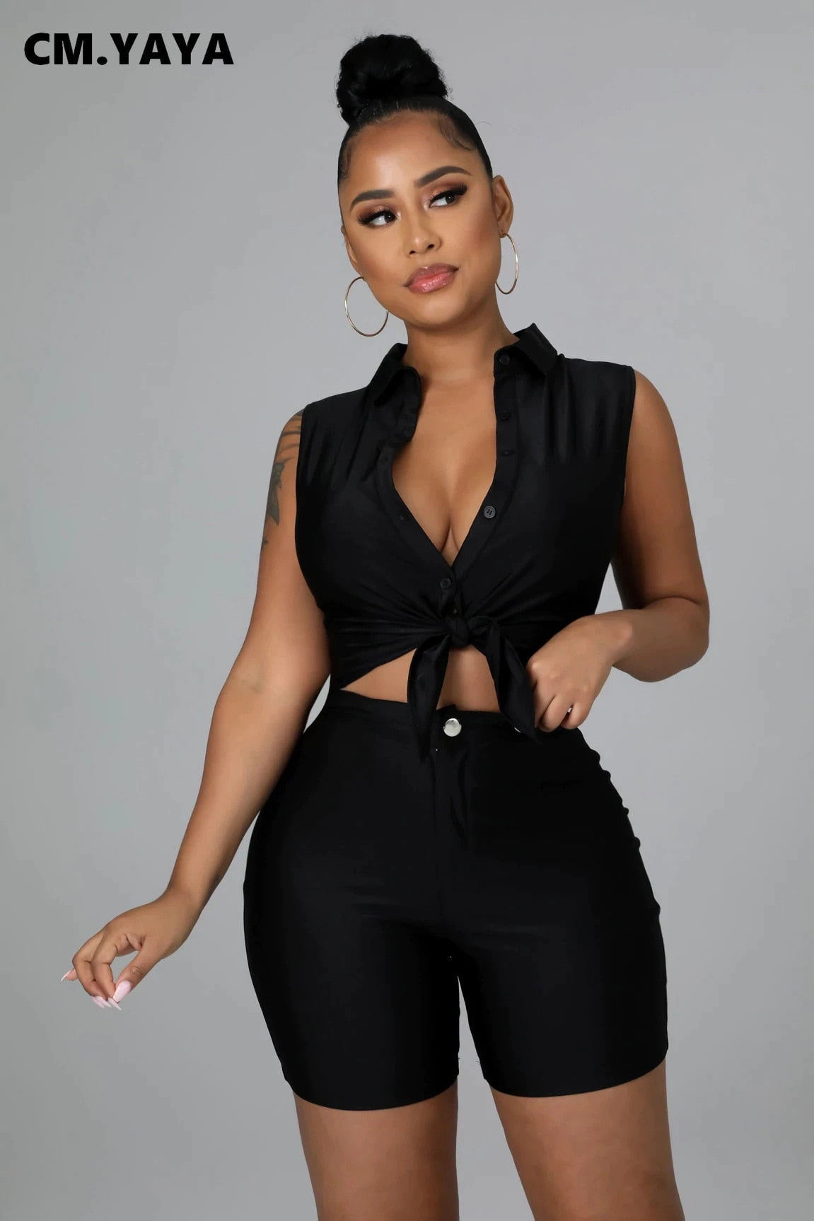 CM.YAYA Elegant Active Women's Set Sleeveless Shirt Top and Shorts Suit Tracksuit Two 2 Piece Set Fitness Outfits 2022 Summer