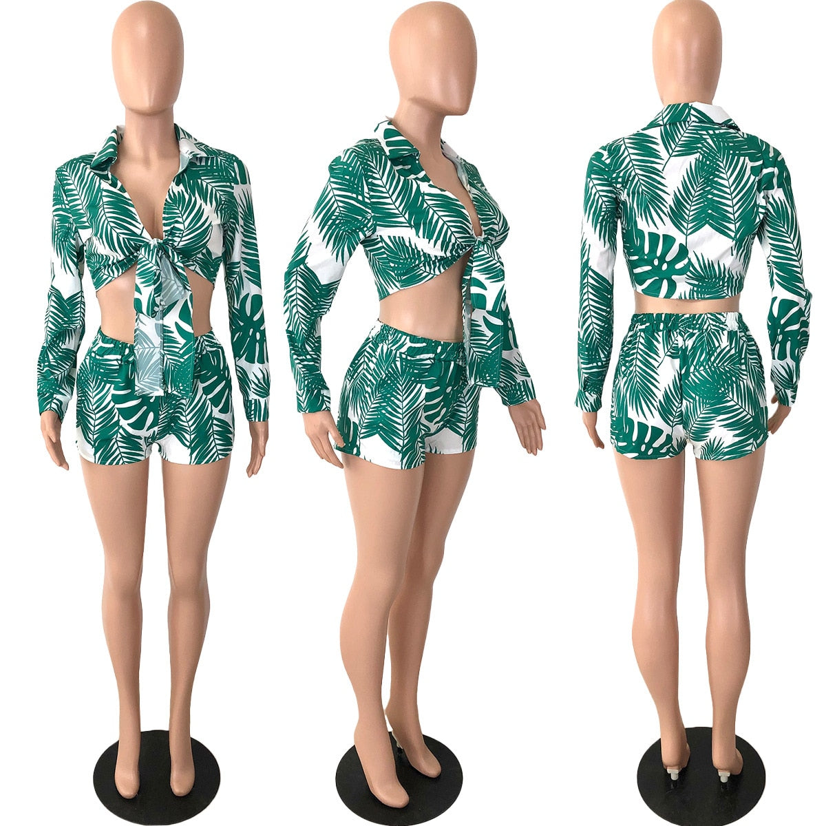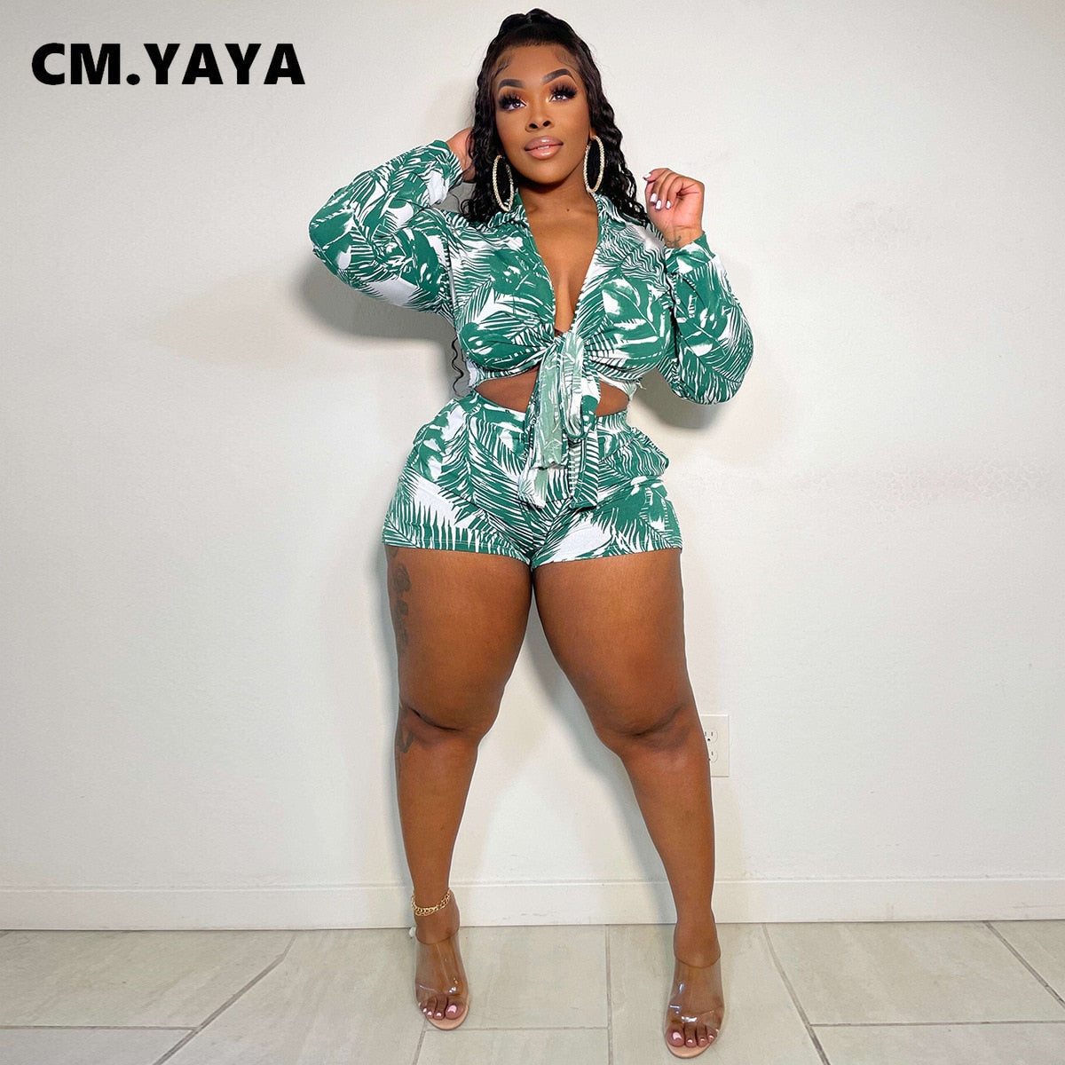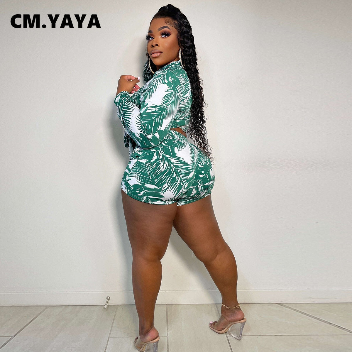 CM.YAYA Elegant Beach Leaf Women Two 2 Piece Set Outfits Sweatsuit 2022 Summer Shirt and Shorts Holiday Matching Set Tracksuit
