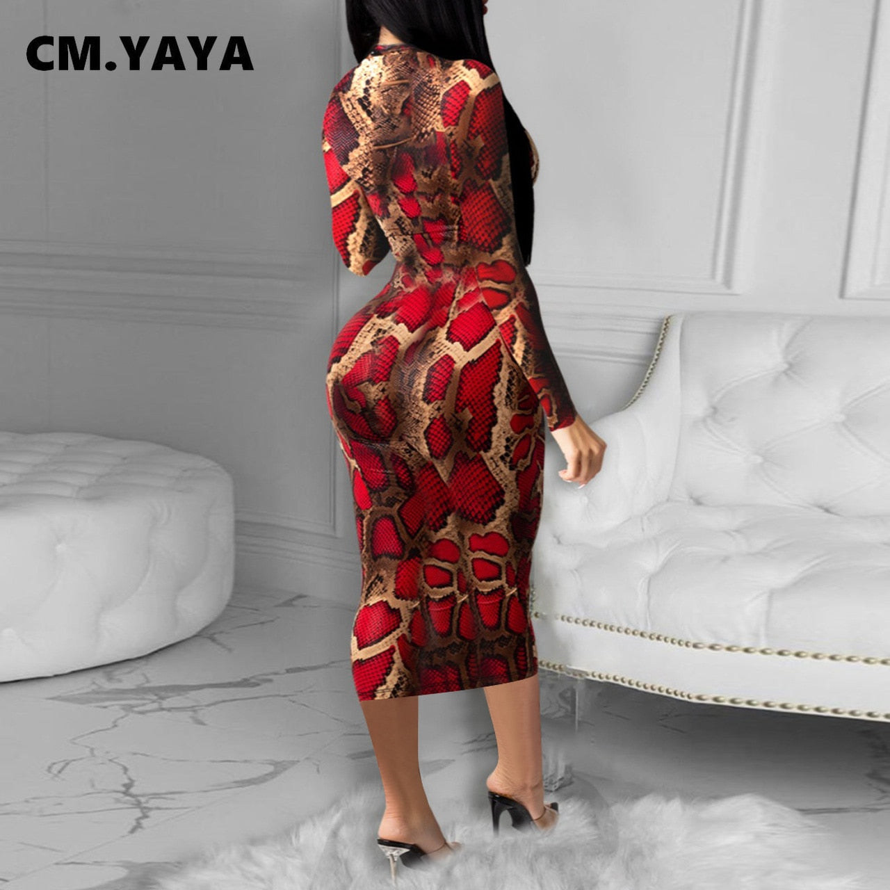 CM.YAYA Fall Winter Street Leopard Print Women Midi Dress Long Sleeve Active Bodycon Sexy Club Party Pencil Mid-Calf Dresses