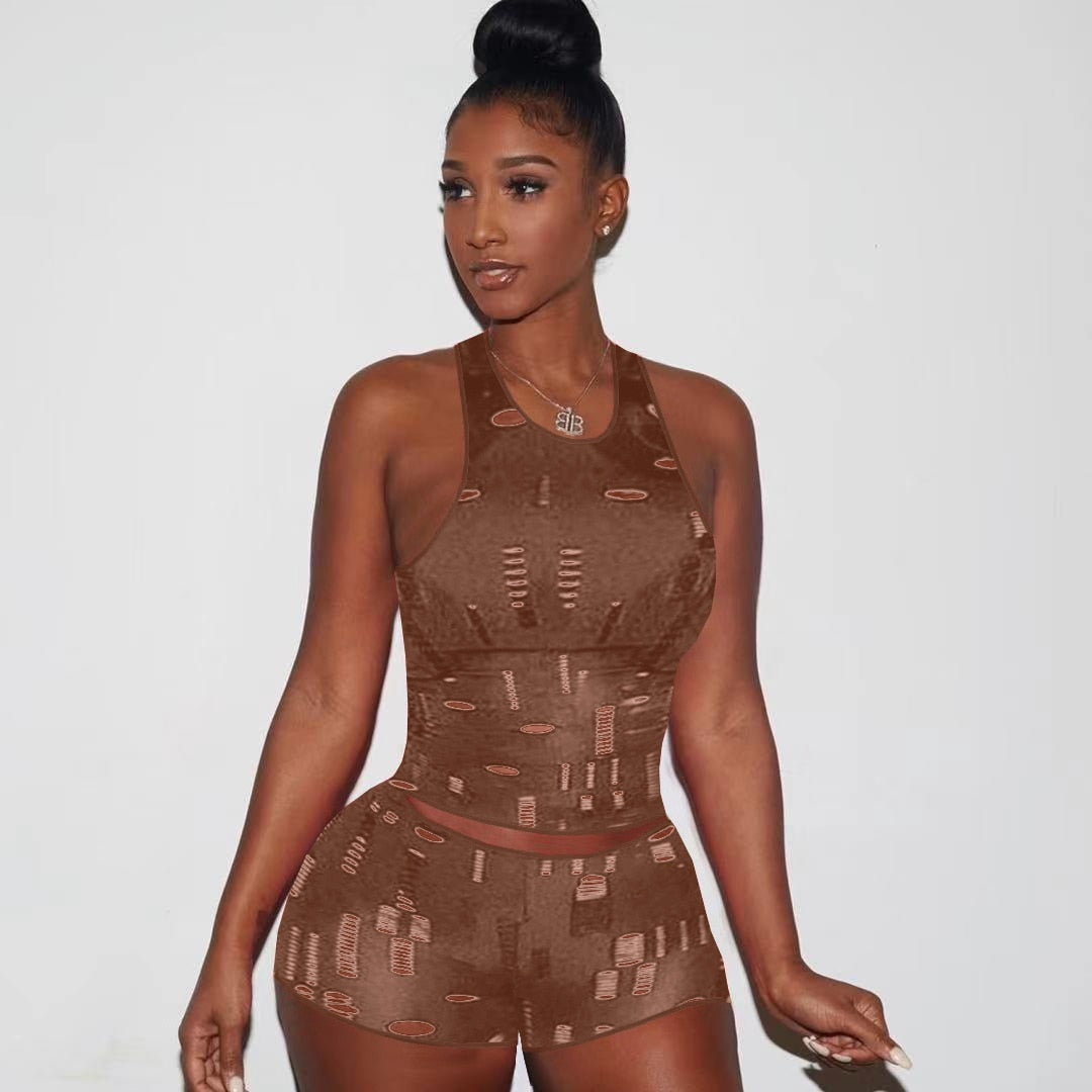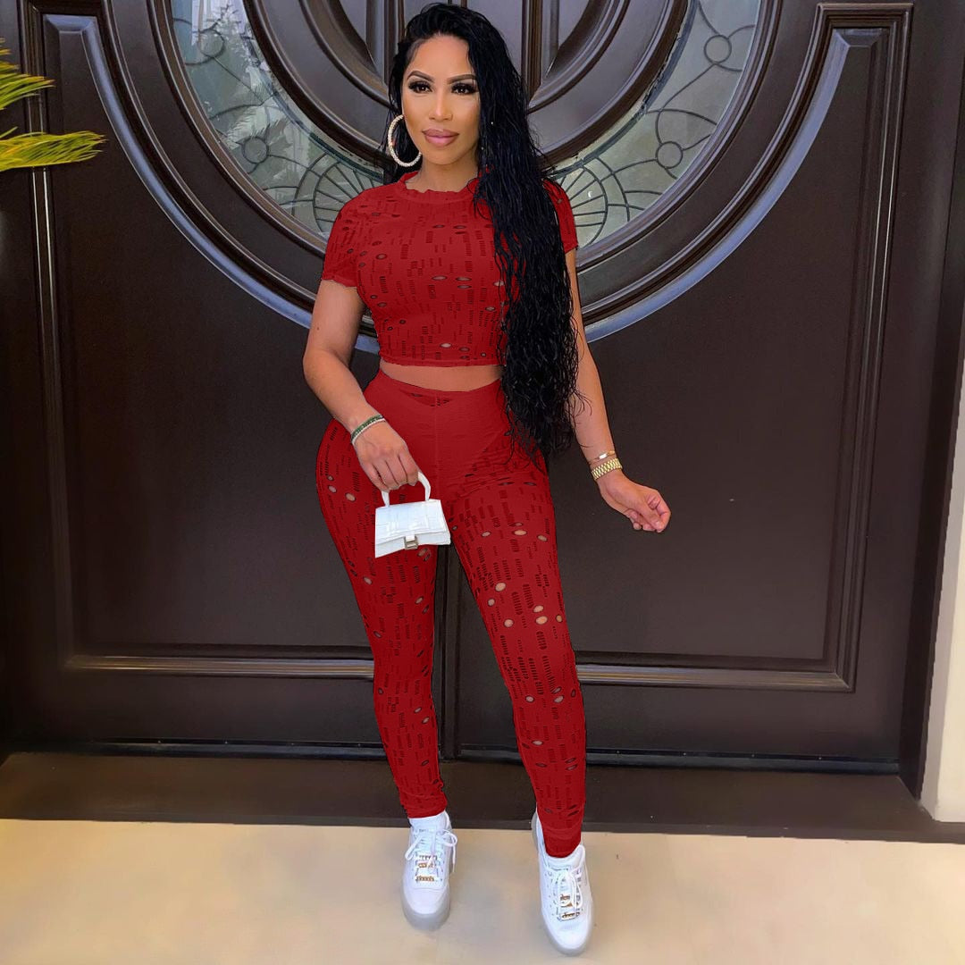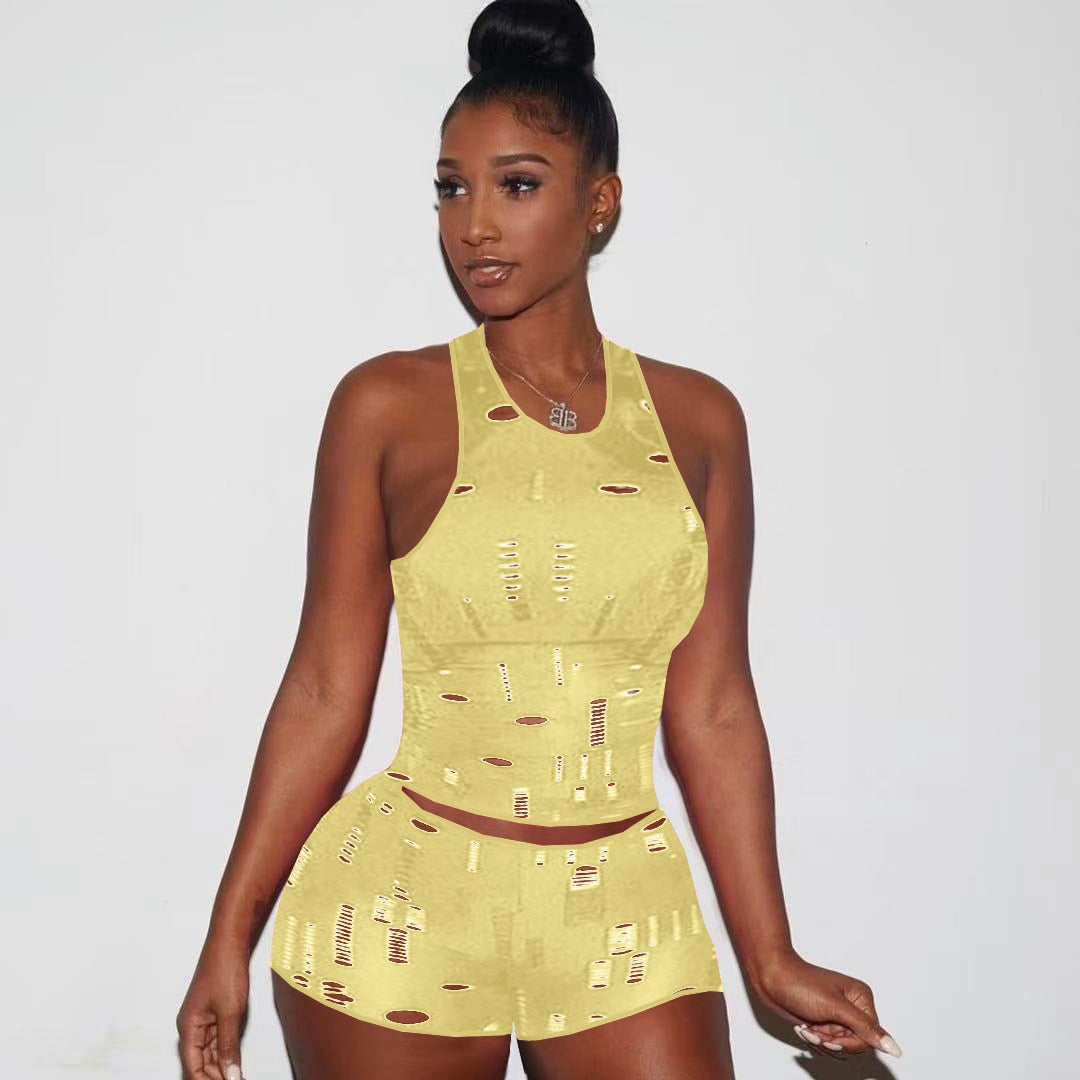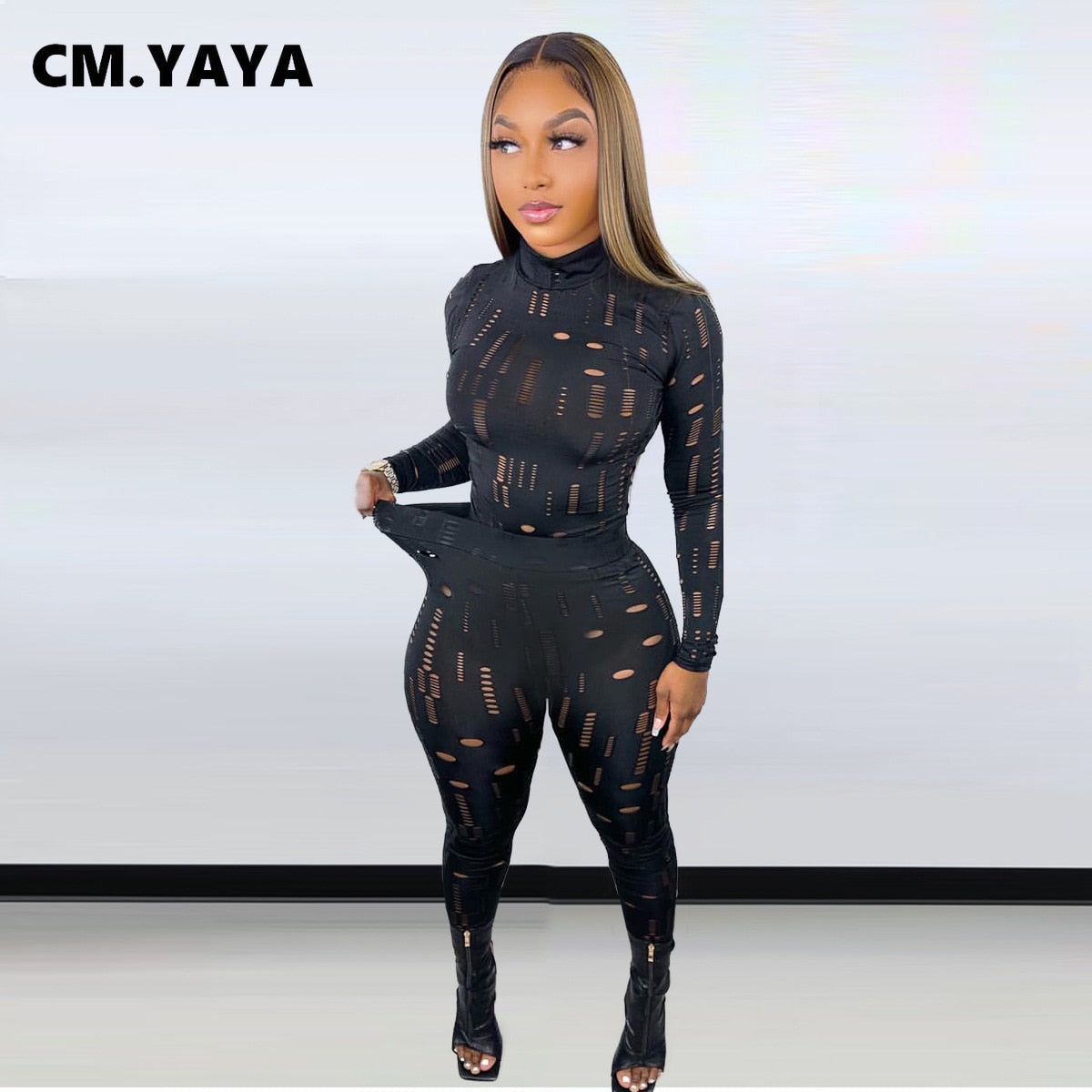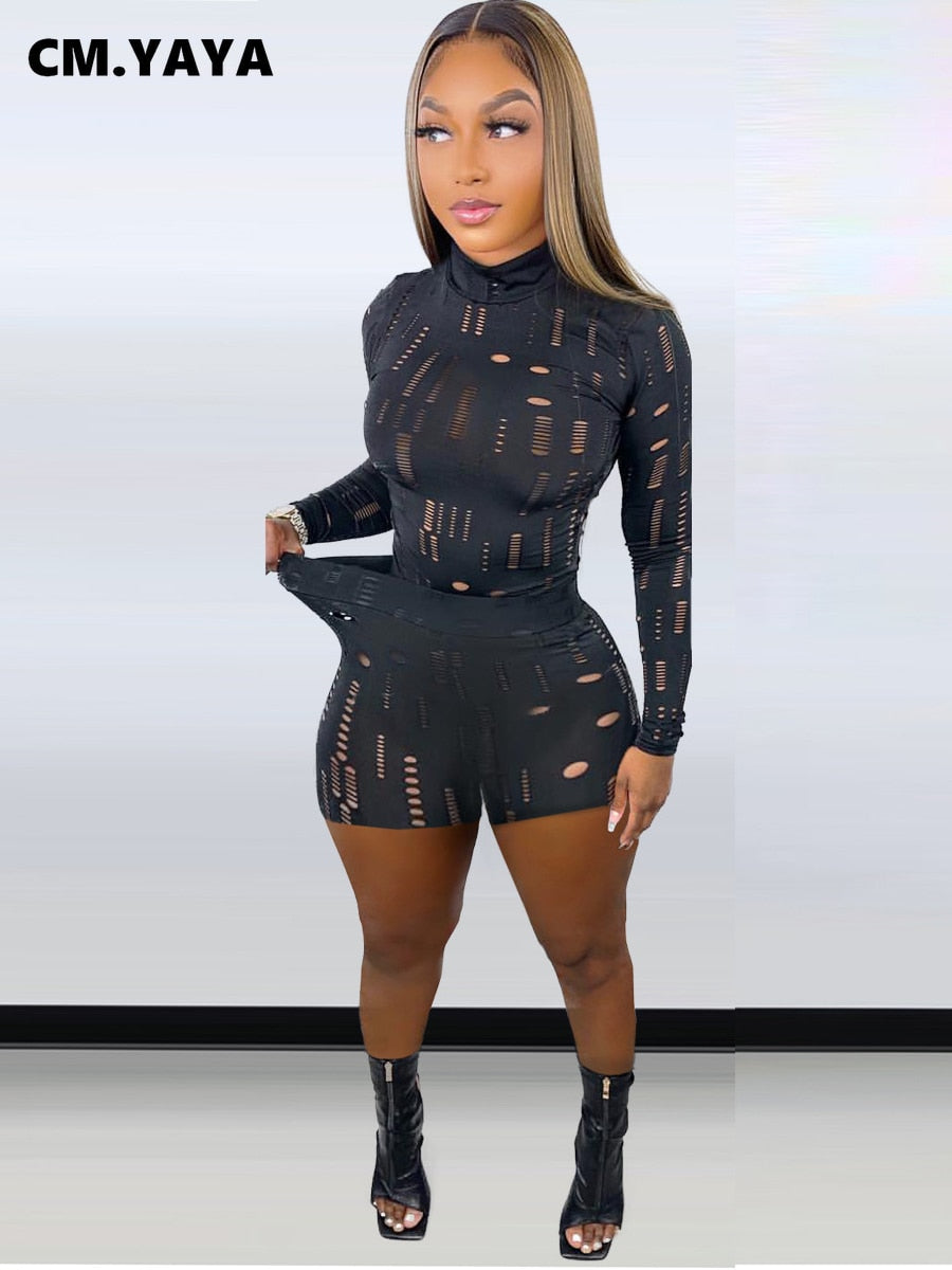 CM.YAYA Hole Active Women Set Long Sleeve T-shirt and Shorts Suit Sport Tracksuit Two Piece Set Fitness Outfit Black Tracksuit