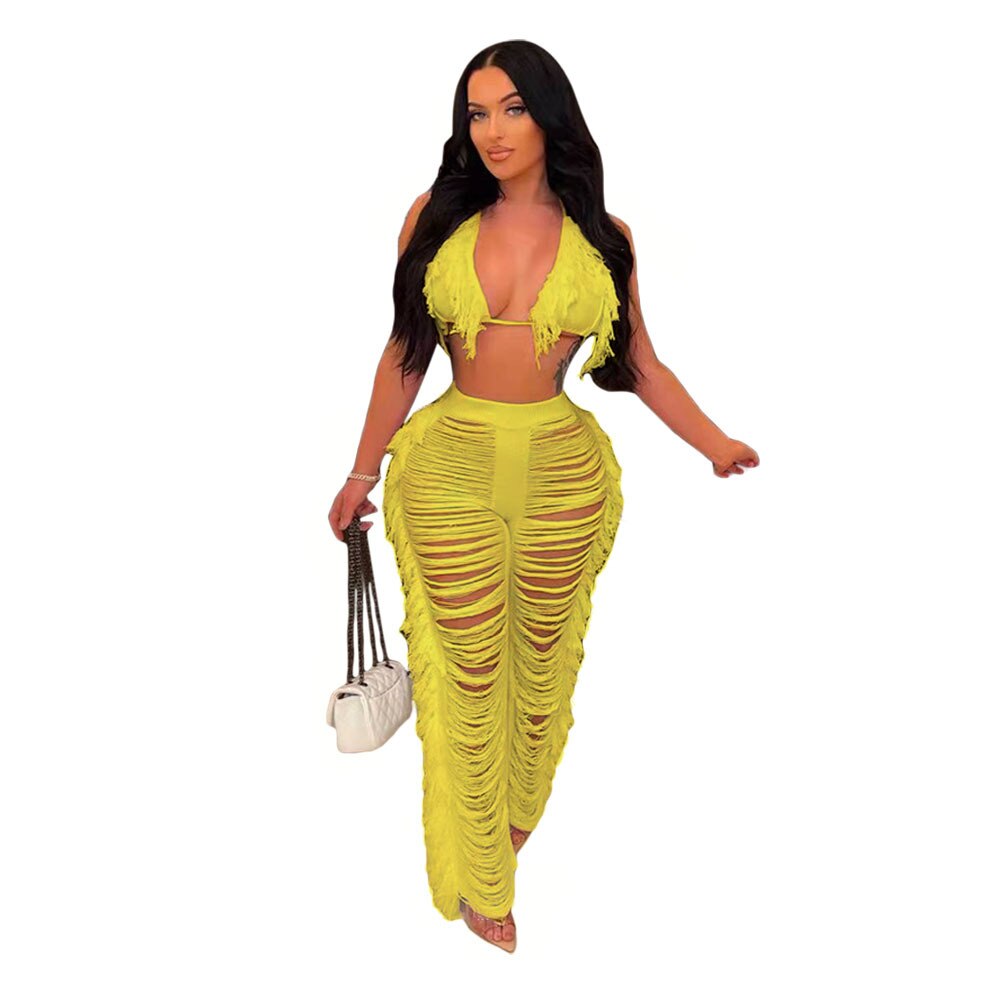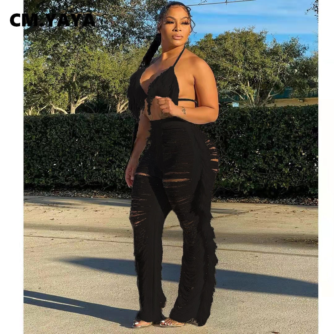 CM.YAYA Sexy Beach White Women 2pcs Set Tassel Crop Tops and Hole Wide Leg Pants Set Sweatsuit Tracksuit Two Piece Set Outfits