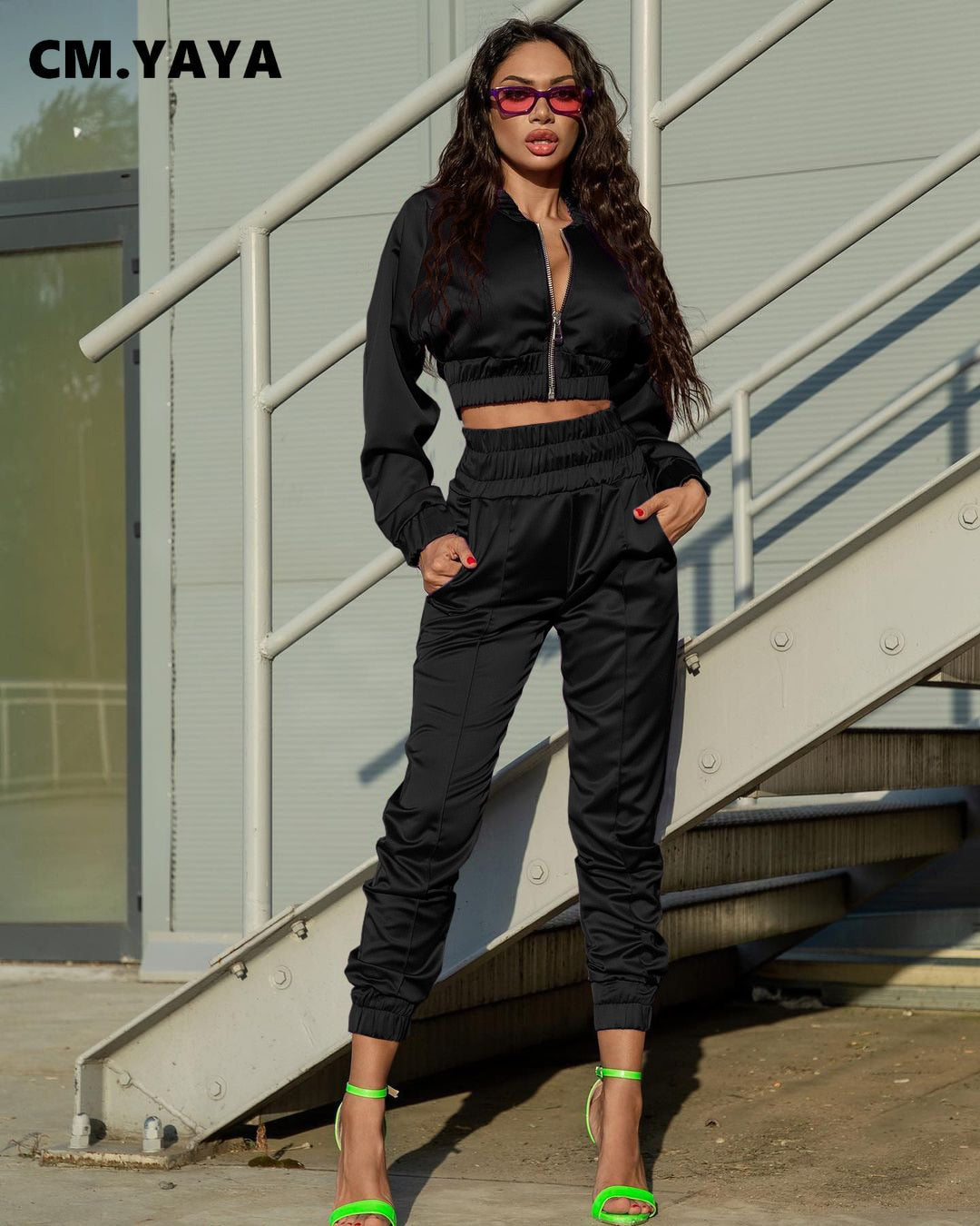 CM.YAYA Sport Bright Solid Women's Set Track Jacket and Pants Suit Active Sweatsuit Tracksuit Two Piece Set Fitness Outfits