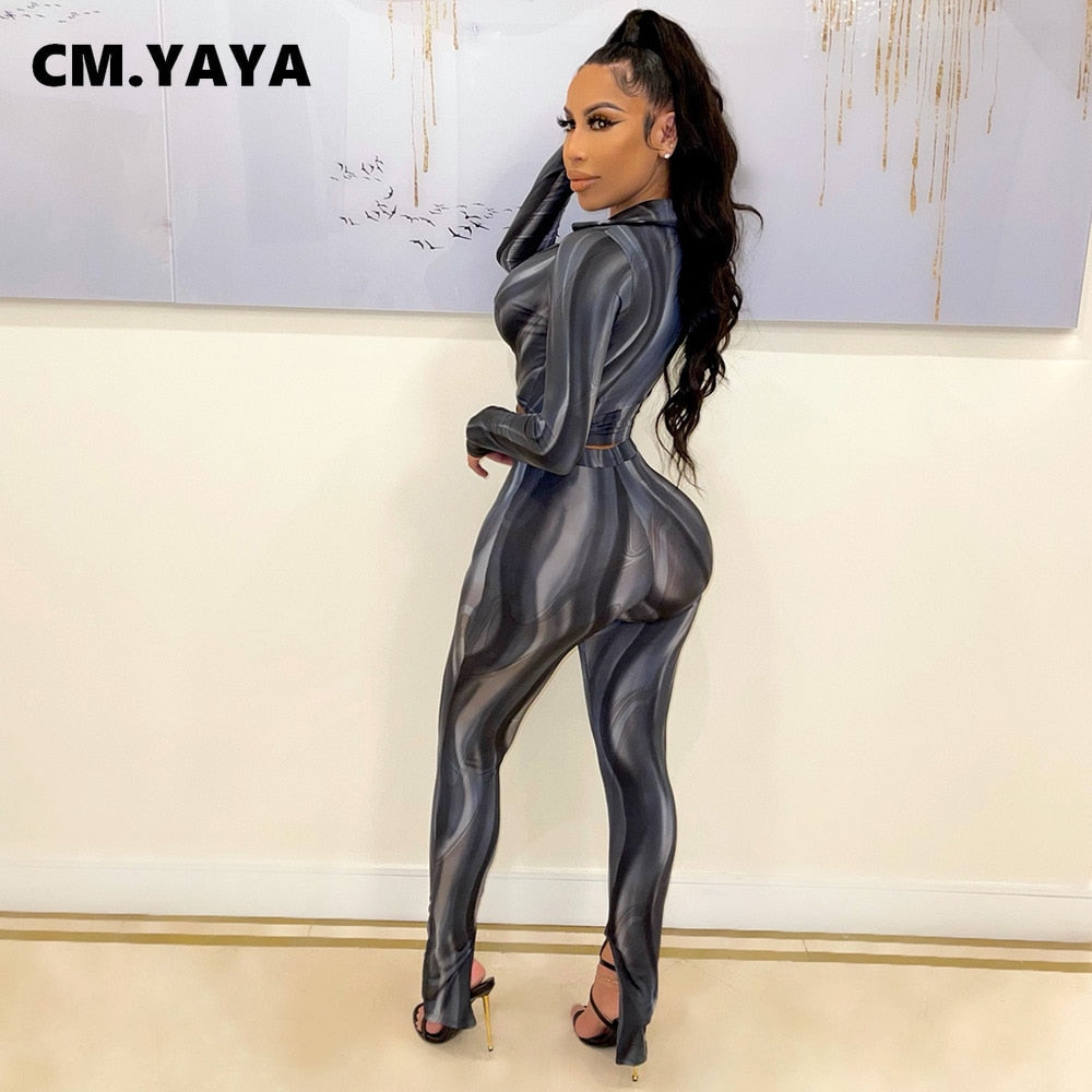 CM.YAYA Spring Winter Wave Striped Women Two 2 Piece Set Outfits Tie Up Mini Shirts and Legging Pants Set Street Sport Tracksuit