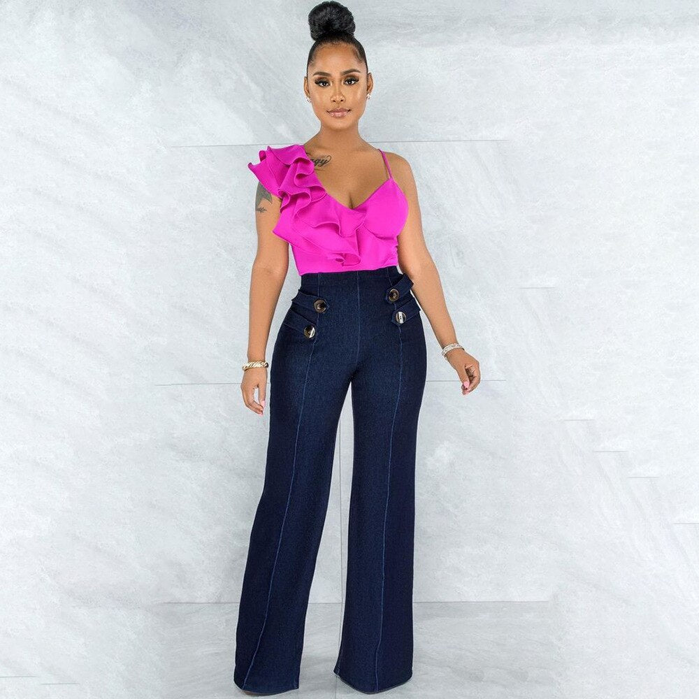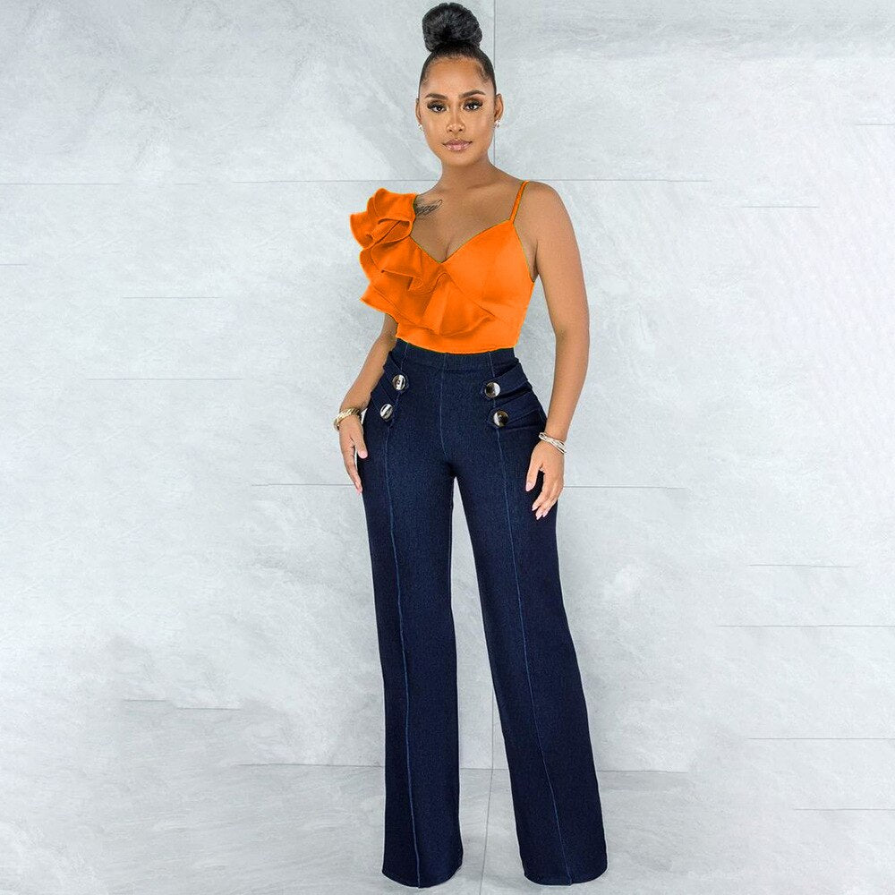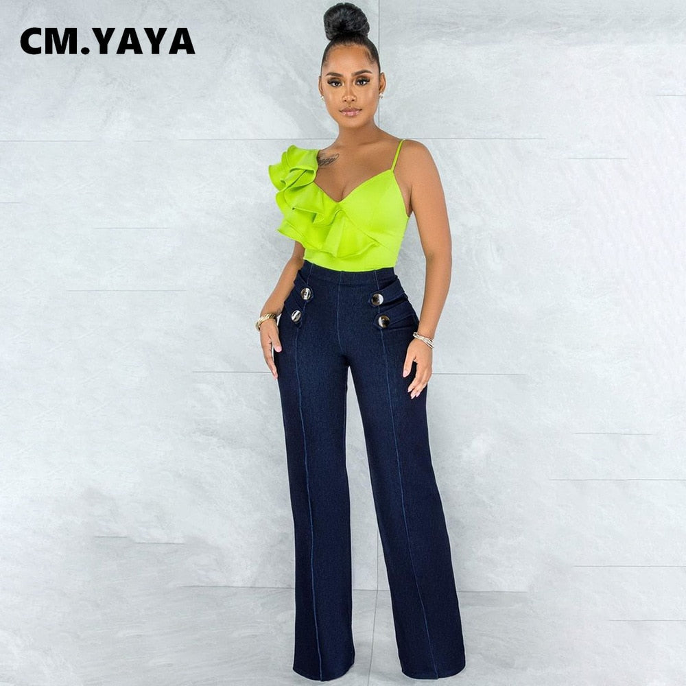 CM.YAYA Women Camis Solid Ruffles Spaghetti Strap V-neck Tops Sexy Night Club Clothing Summer Fashion Top Tees Female 2021