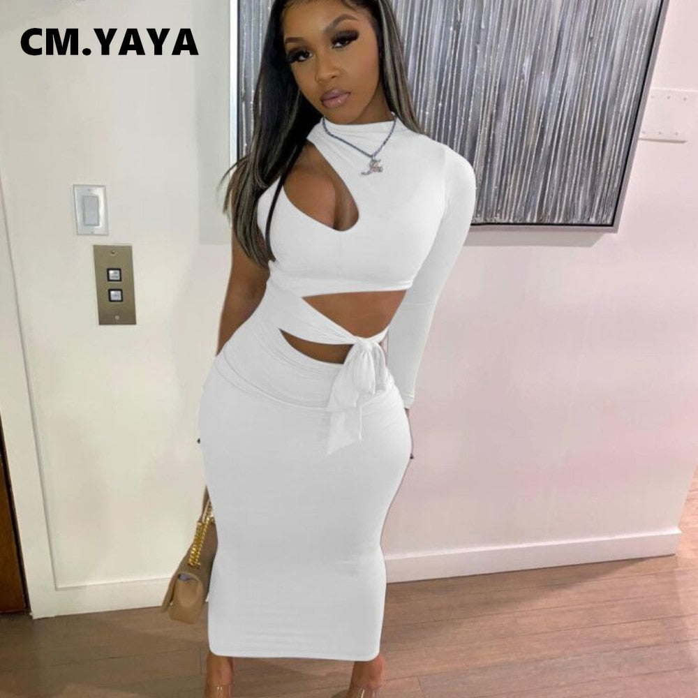 CM.YAYA Women Cut Out Holo One Long Sleeve Bodycon Women Midi Maxi Dress Sexy Night Party Clubwear Long Pencil Dresses