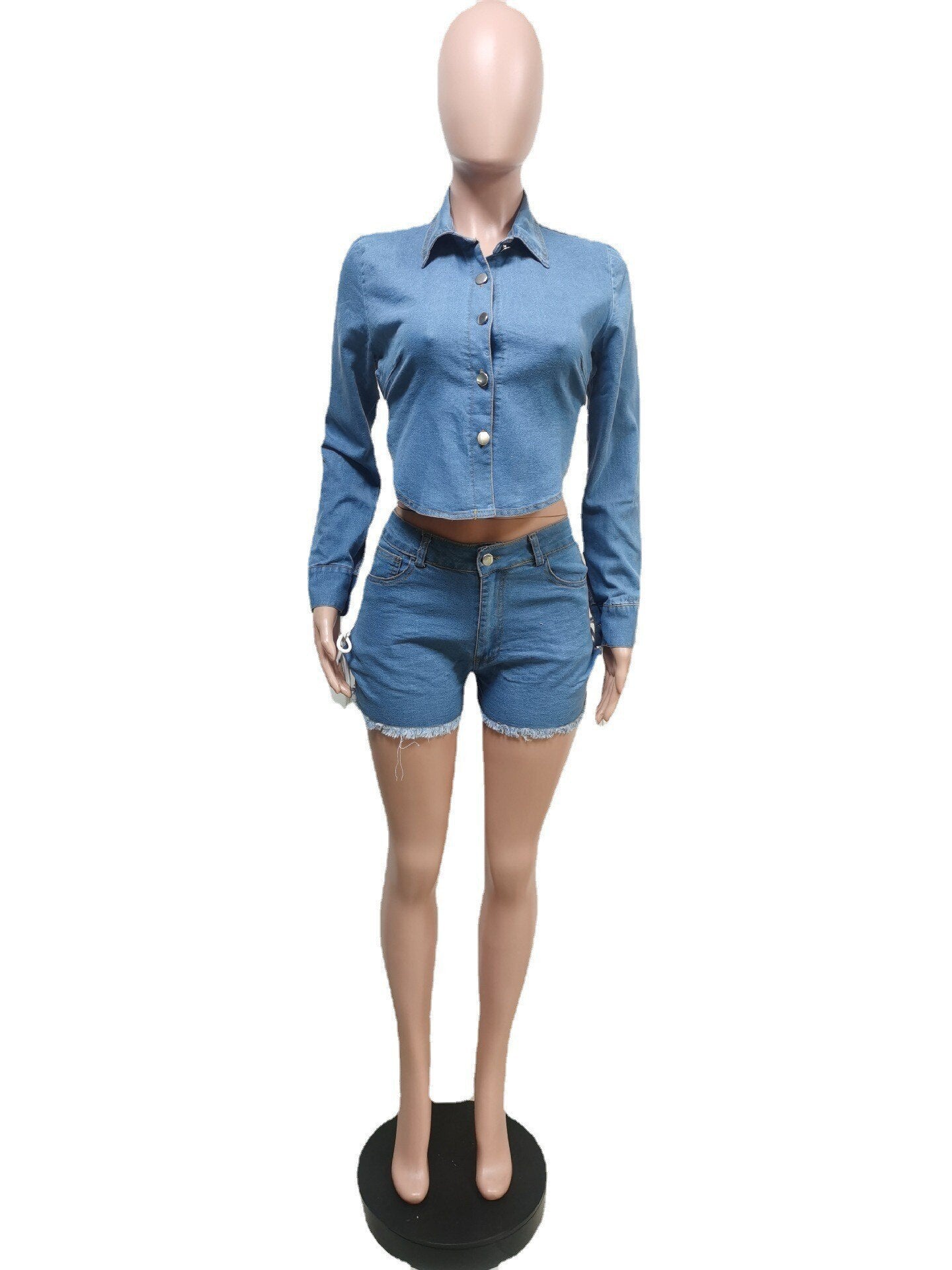 CM.YAYA Women Denim Two 2 Piece Set Classic Backless Crop Tops and Lace Up Shorts Matching Set Outfits Streetwear Jean Tracksuit