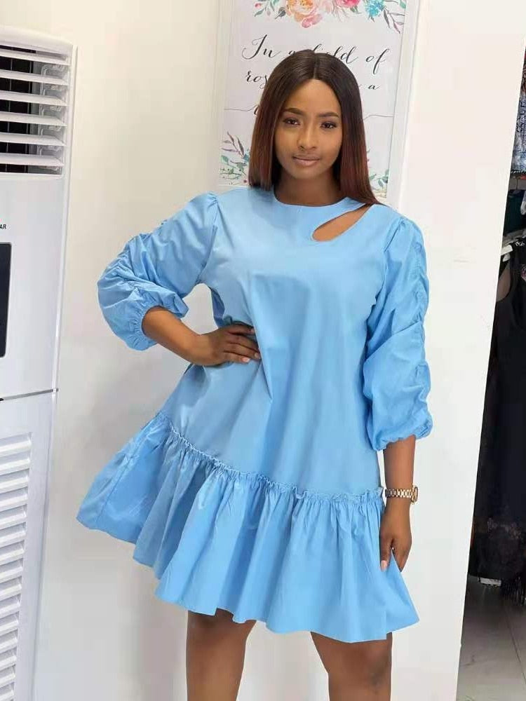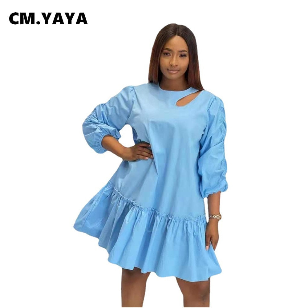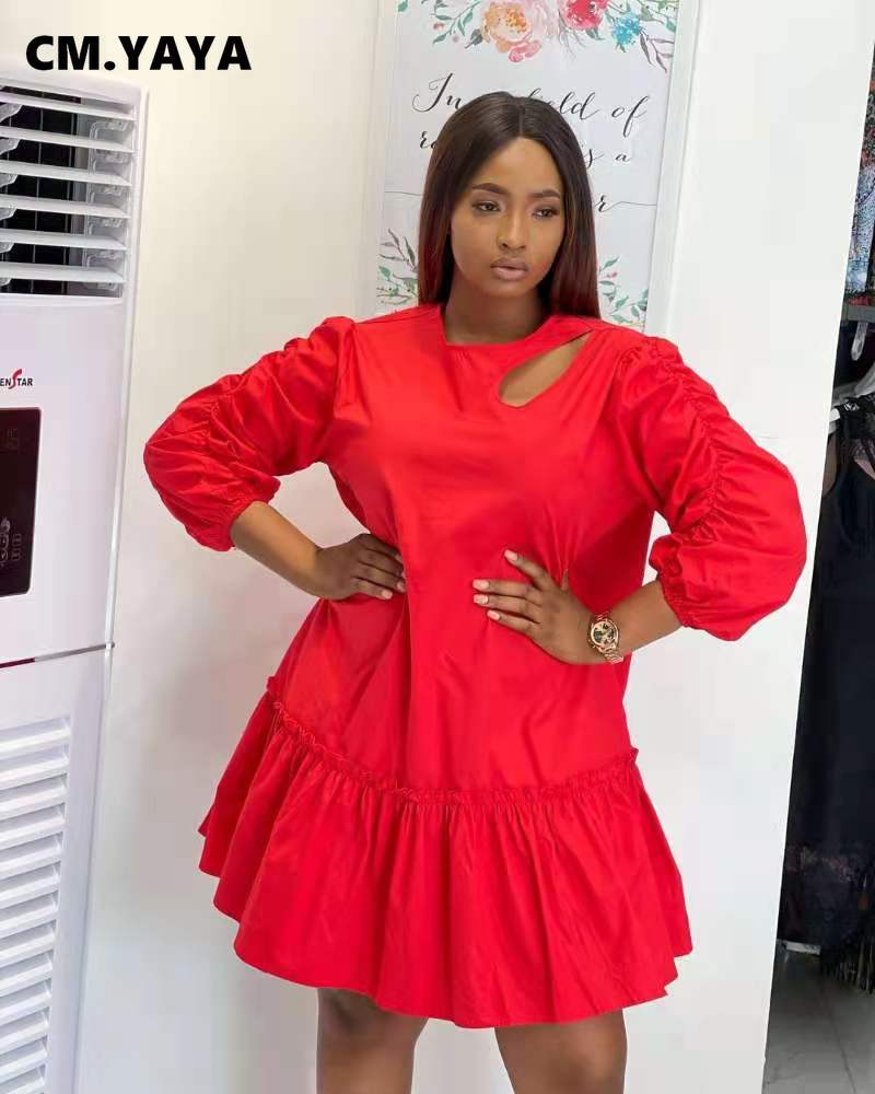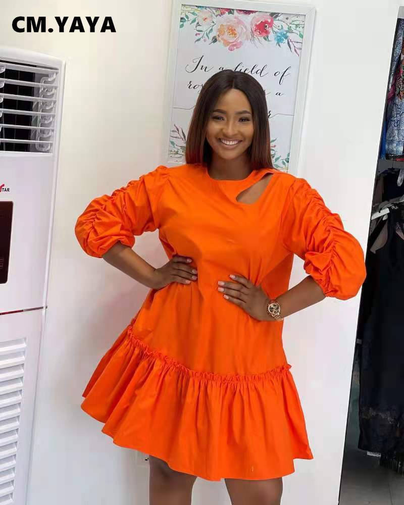CM.YAYA Women Dress Solid Full Puff Sleeve O-neck Cut Out Zip Ruffles Loose Mini Dresses Fashion Casual Vestidos Summer Outfits