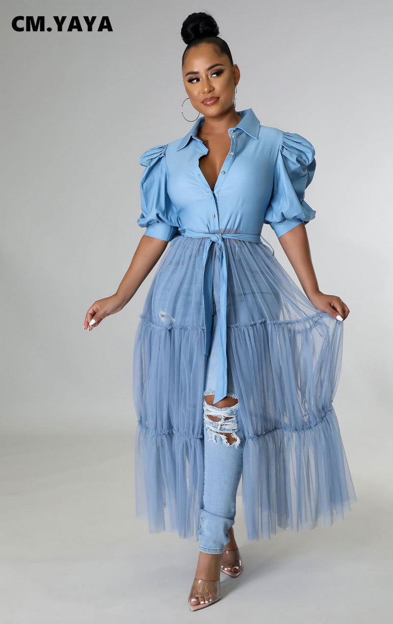 CM.YAYA Women Elegant Mesh Patchwork Lantern Short Sleeve High Waist Single Breasted Shirt Style Long Maxi Dress 2022 Summer