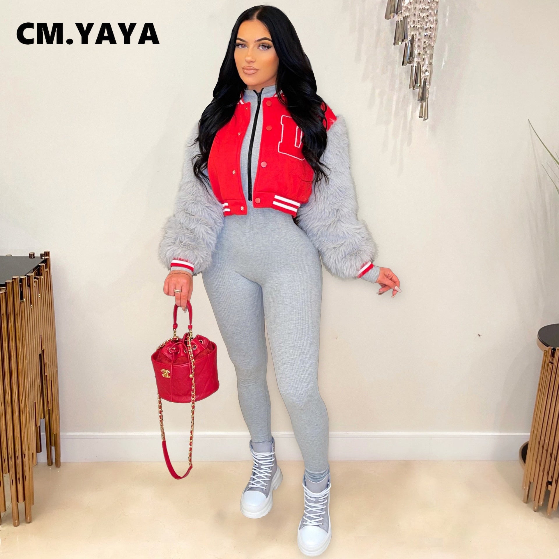 CM.YAYA Women Faux Cony Hair Long Sleeve Patchwork Letter Baseball Jacket for Sports Streetwear Winter Spring Outcoats