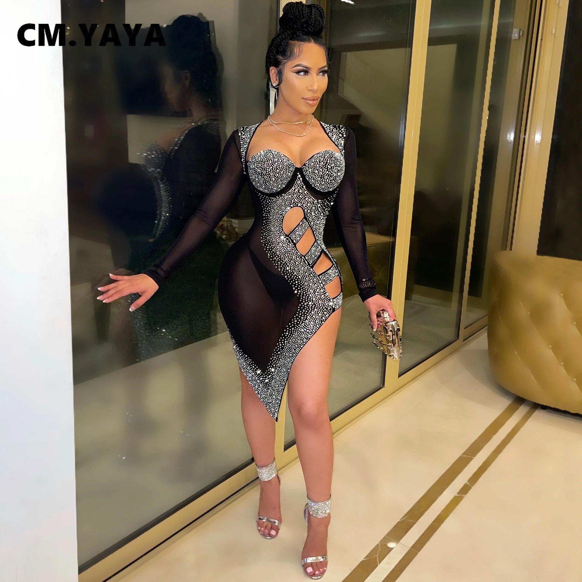 CM.YAYA Women Hot Rhinestone Mesh See Though Bodycon Dress Sexy Night Party Clubplunging Neck Lace Up Side Slit Midi Dresses
