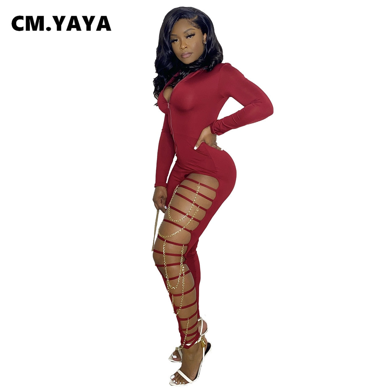 CM.YAYA Women Jumpsuit Solid Full Sleeve Hollow Out Hole Chain Stretchy Pencil Jumpsuits Sexy Night Clubwear Summer Outfits 2021