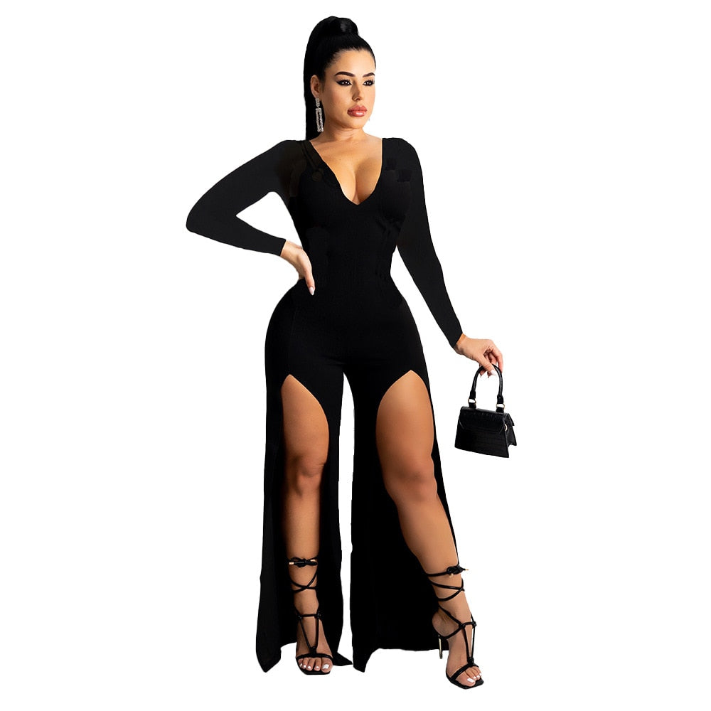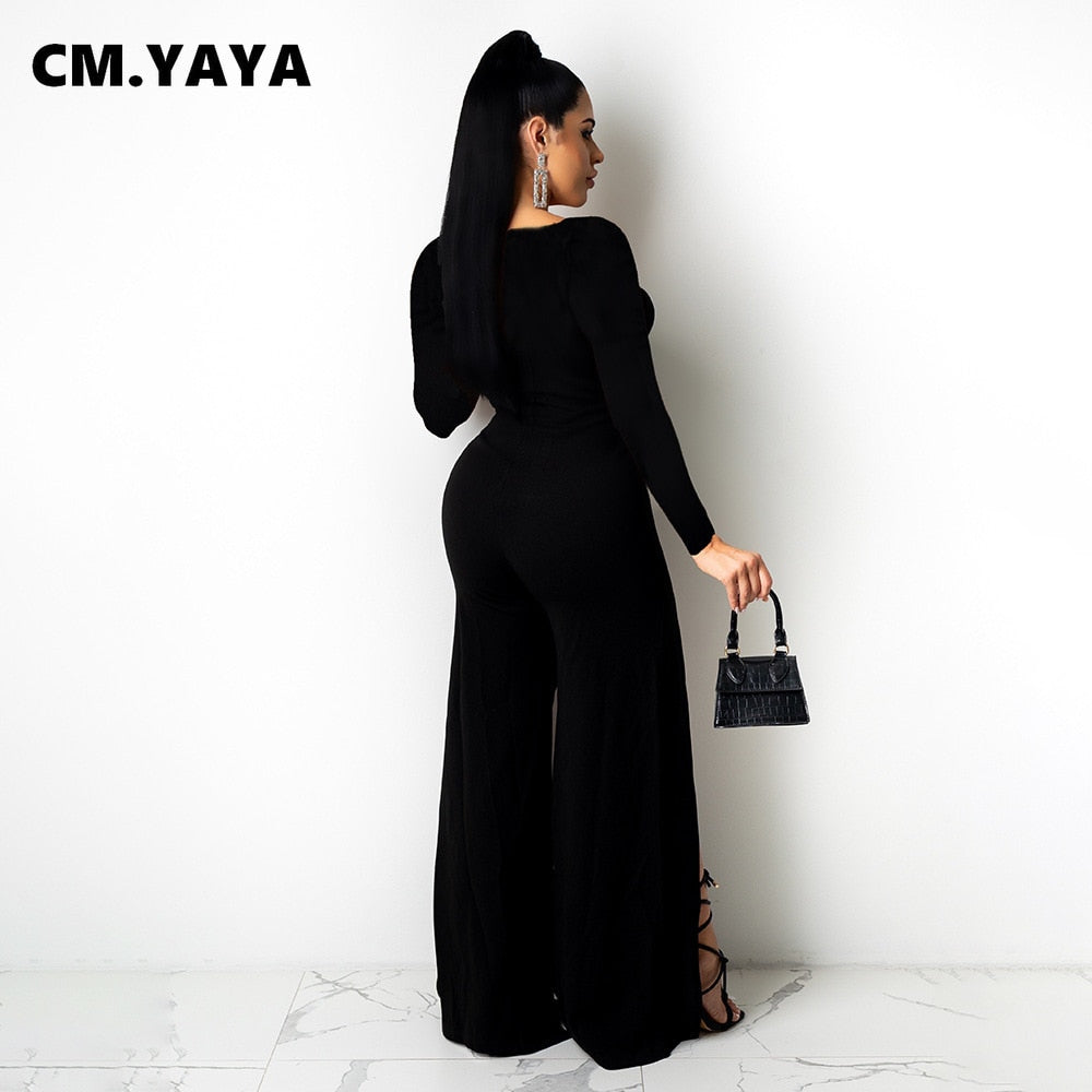 CM.YAYA Women Jumpsuit Solid Full Sleeve V-neck Stretchy Bodycon Skinny Splited Wide Leg Jumpsuits Fashion Outfits Autumn 2021