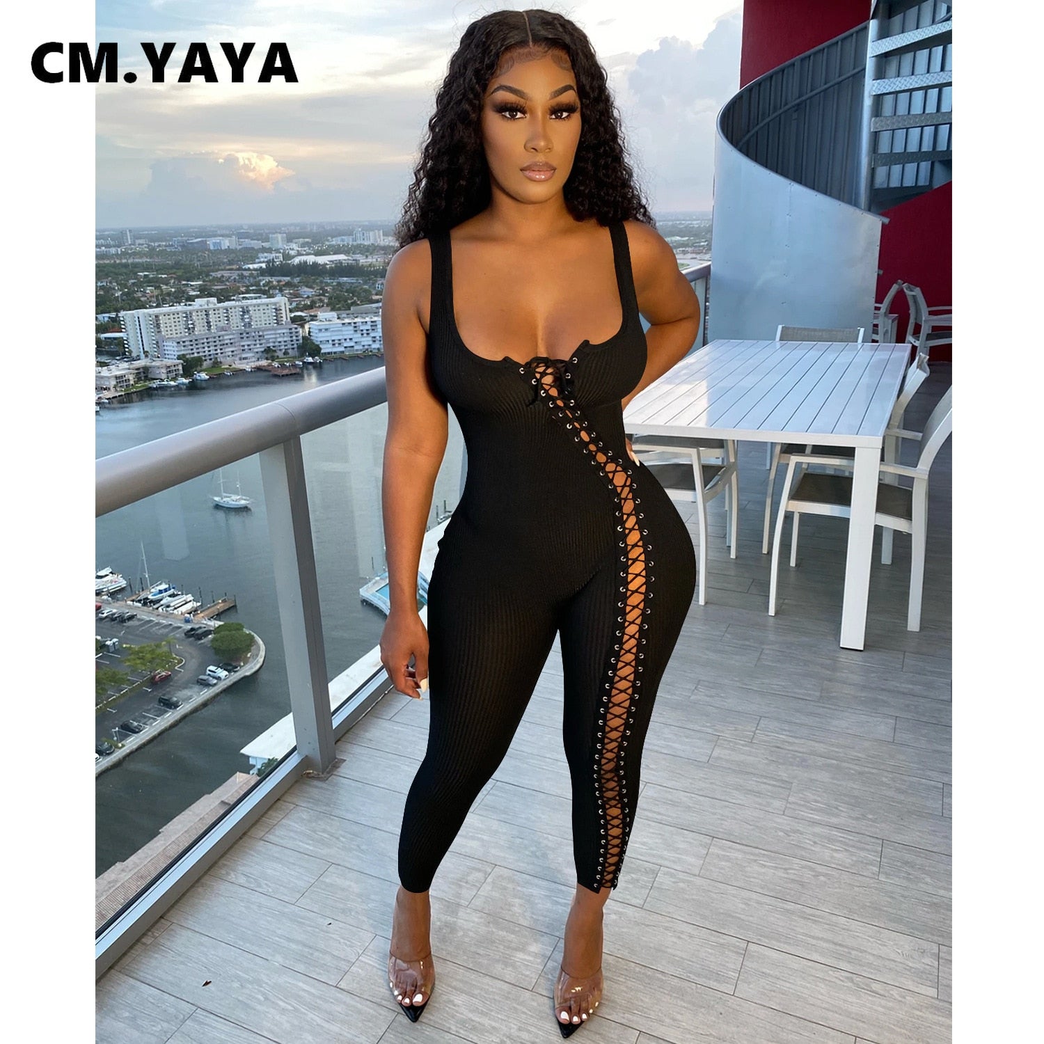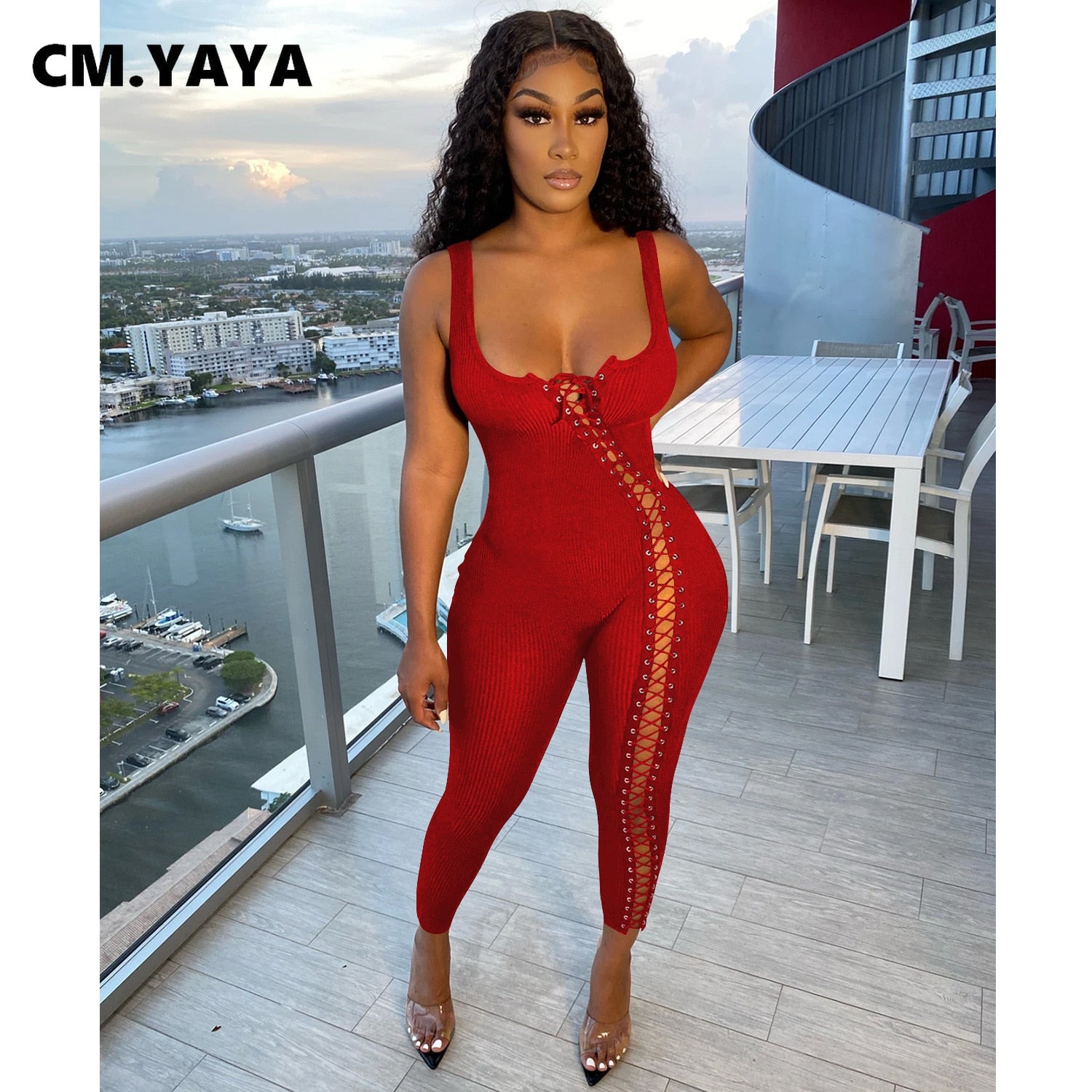 CM.YAYA Women Jumpsuit Solid Sleeveless Squar Collar Bandage Stretchy Bodycon Skinny Jumpsuits Sexy Fashion Outfit Summer 2021