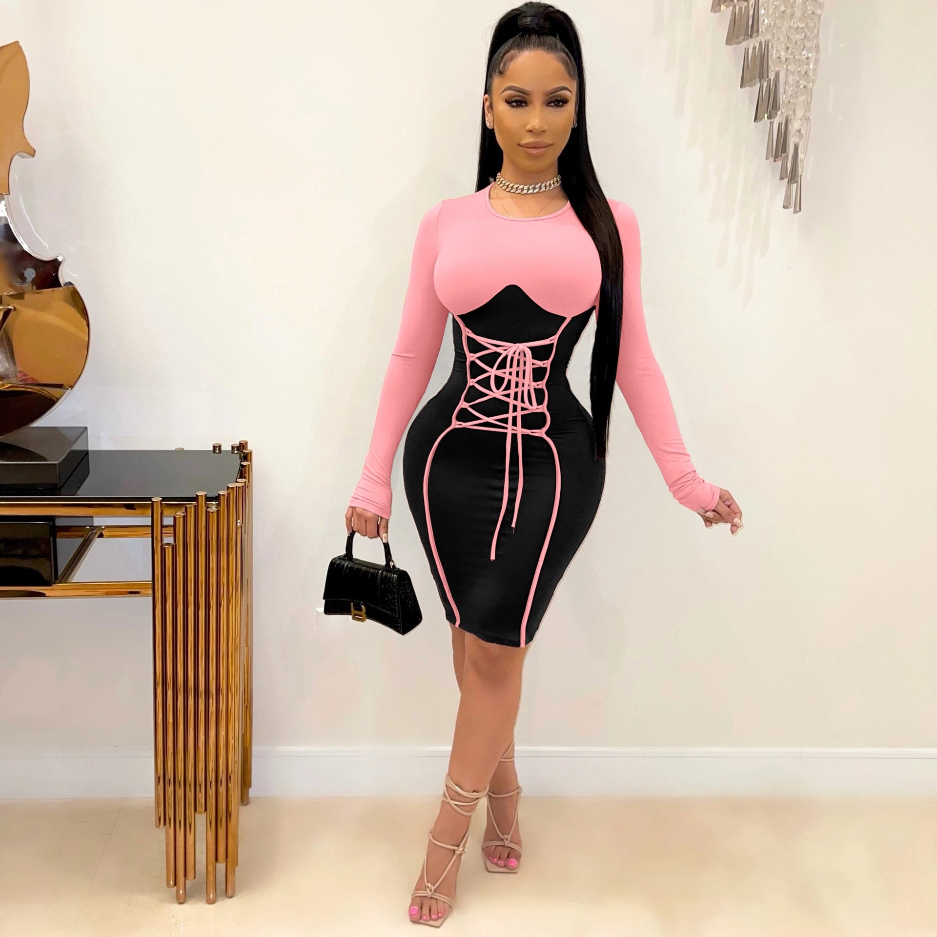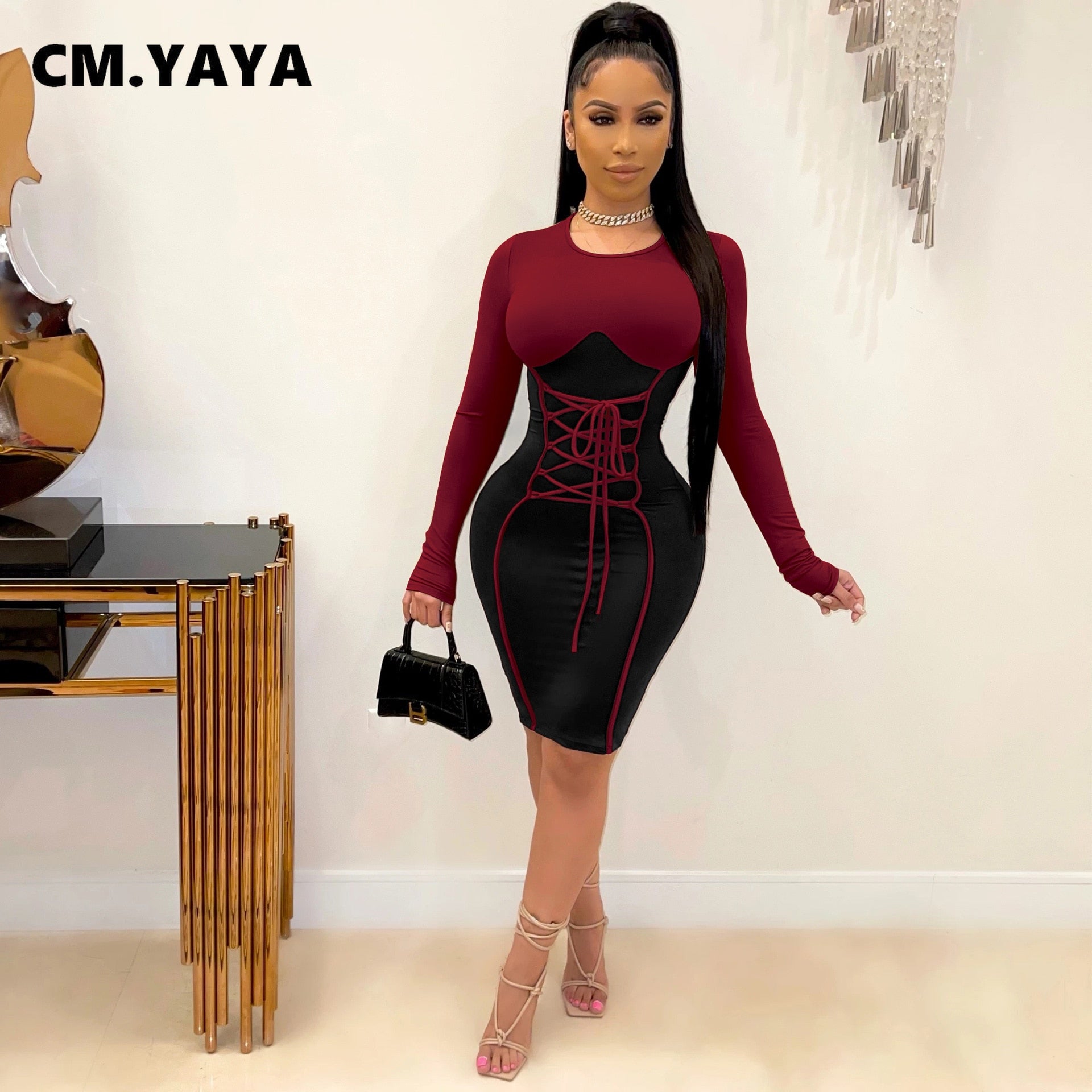 CM.YAYA Women Lace Up Long Sleeve High Waist Tunic Patchwork Bodycon Midi Knee Length Dress Sexy Night Party Pencil Dresses