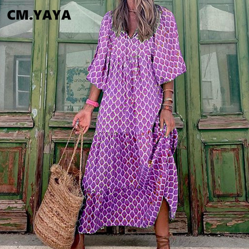 CM.YAYA Women Long Dress Print Half Sleeve V-neck Loose Maxi Dresses Vintage Fashion Vestidos Casual Outfits Autumn 2021