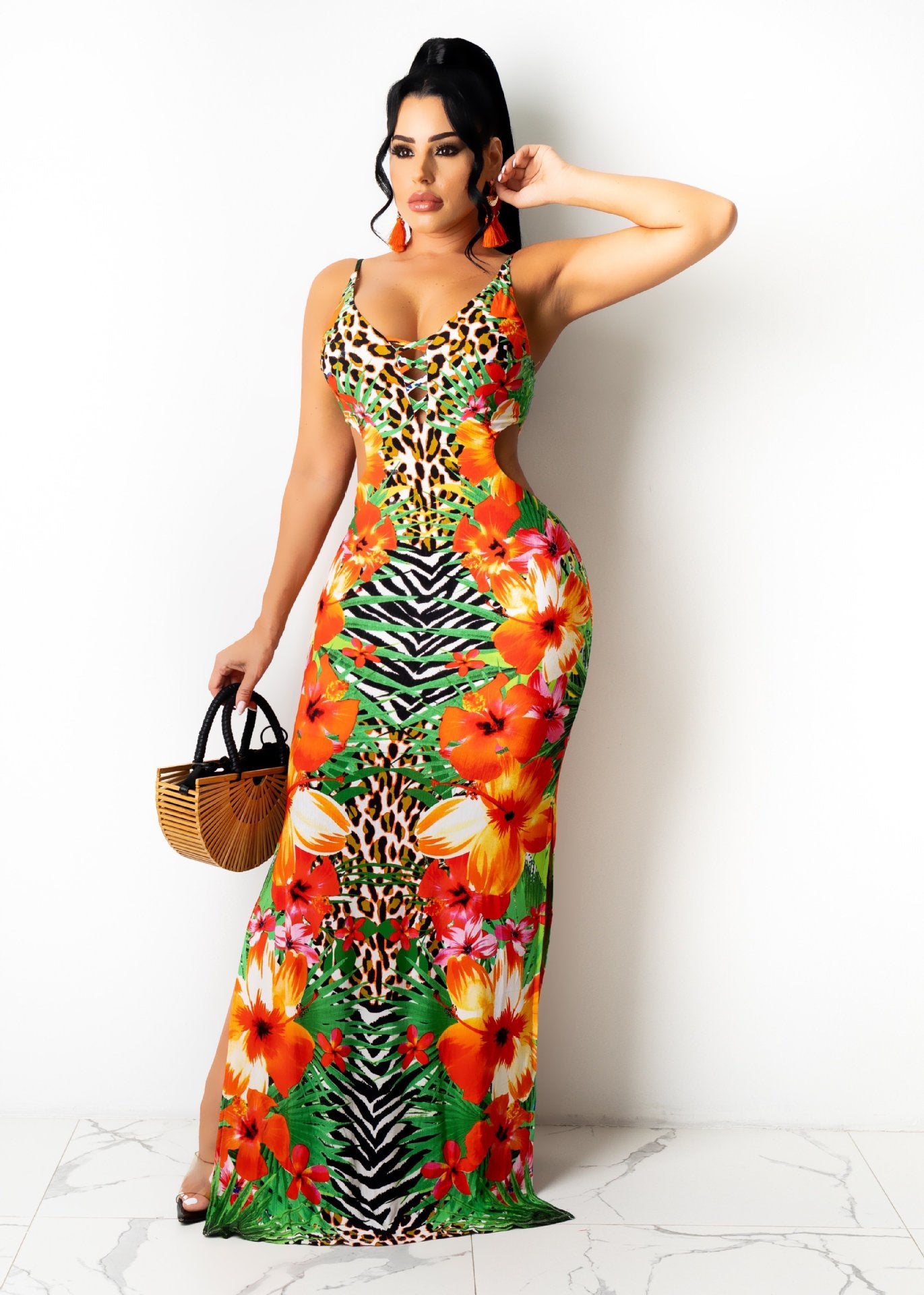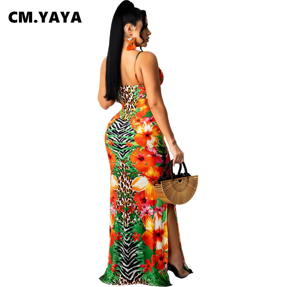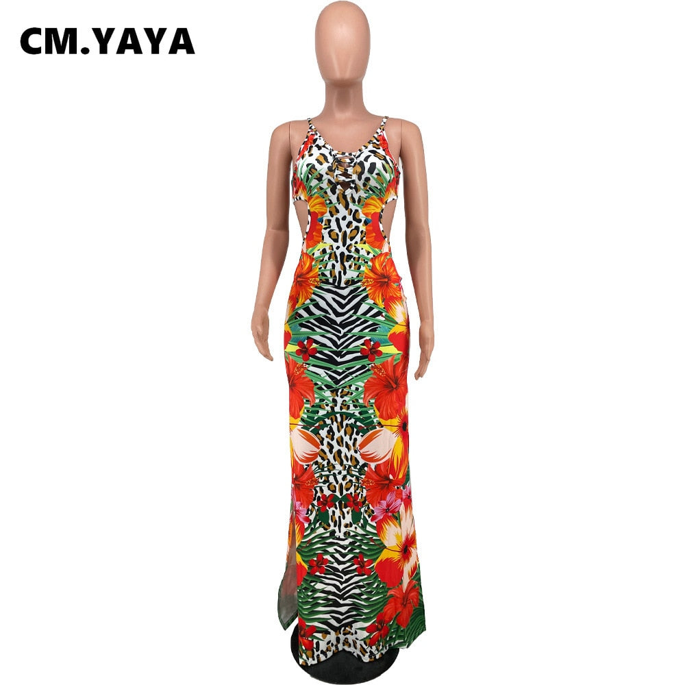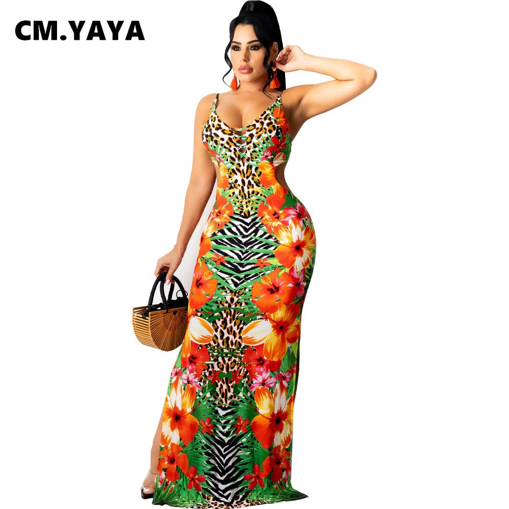 CM.YAYA Women Long Dress Print Sleeveless Strap V-neck Hole Hollow Out Stretchy Bodycon Maxi Dresses Sexy Fashion Outfit Summer