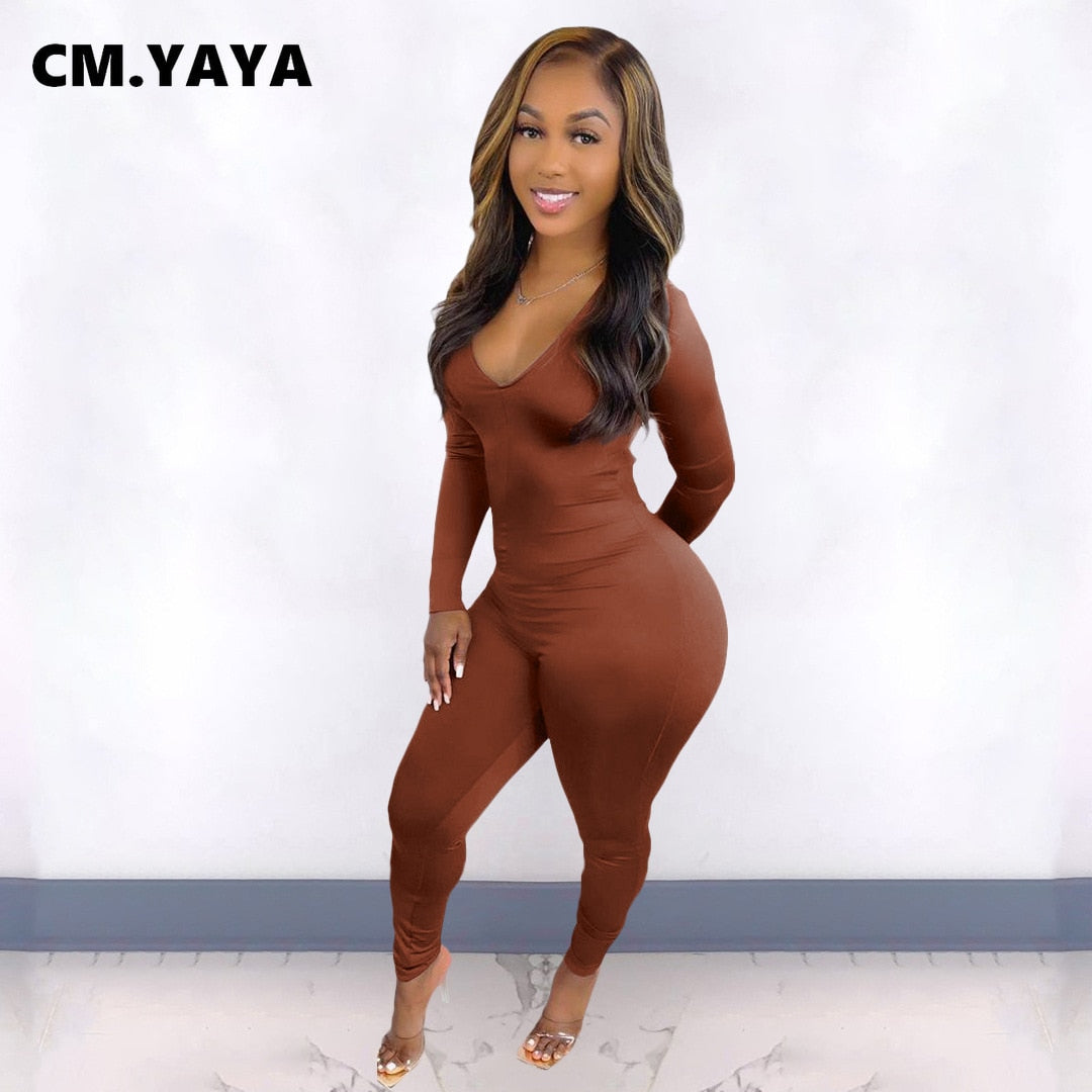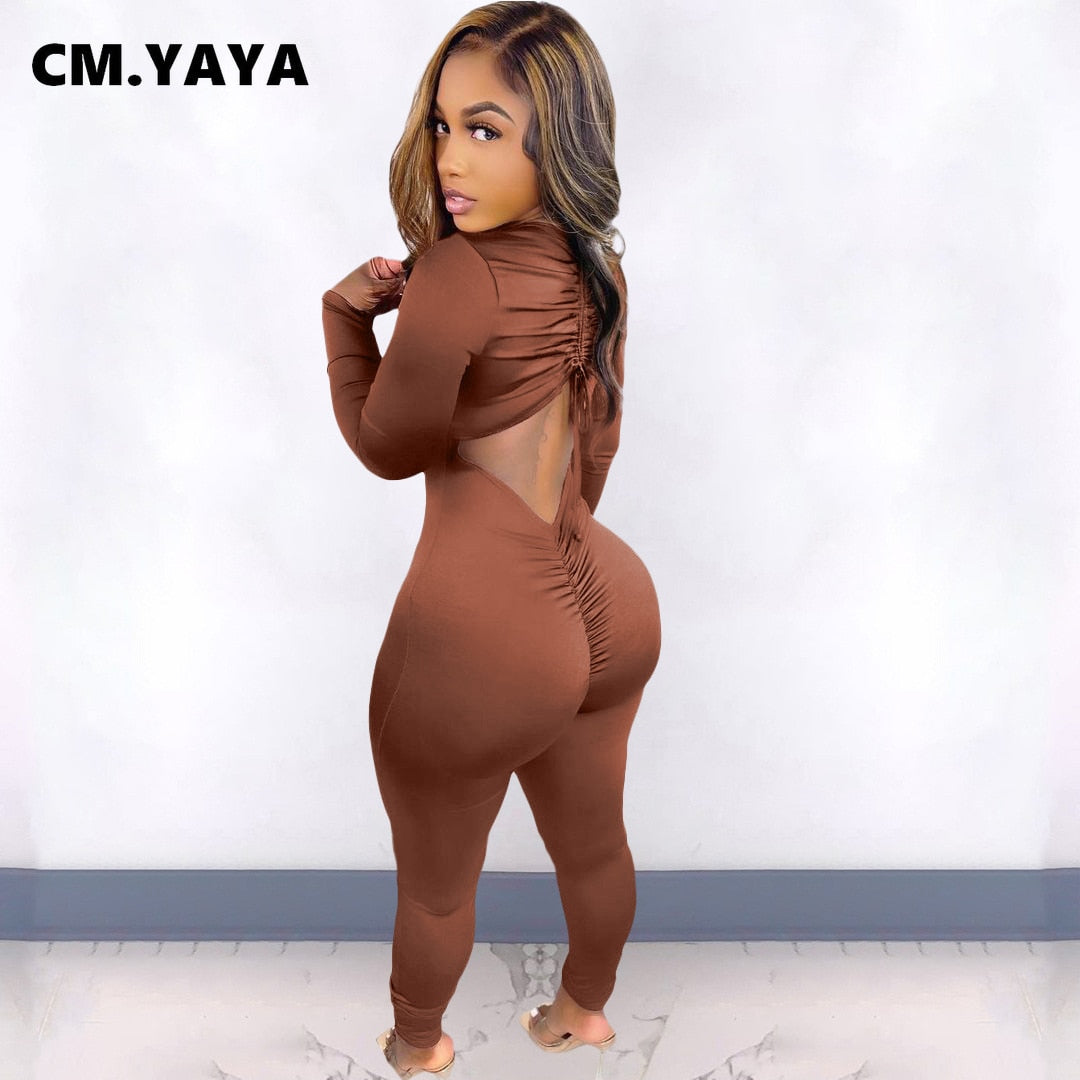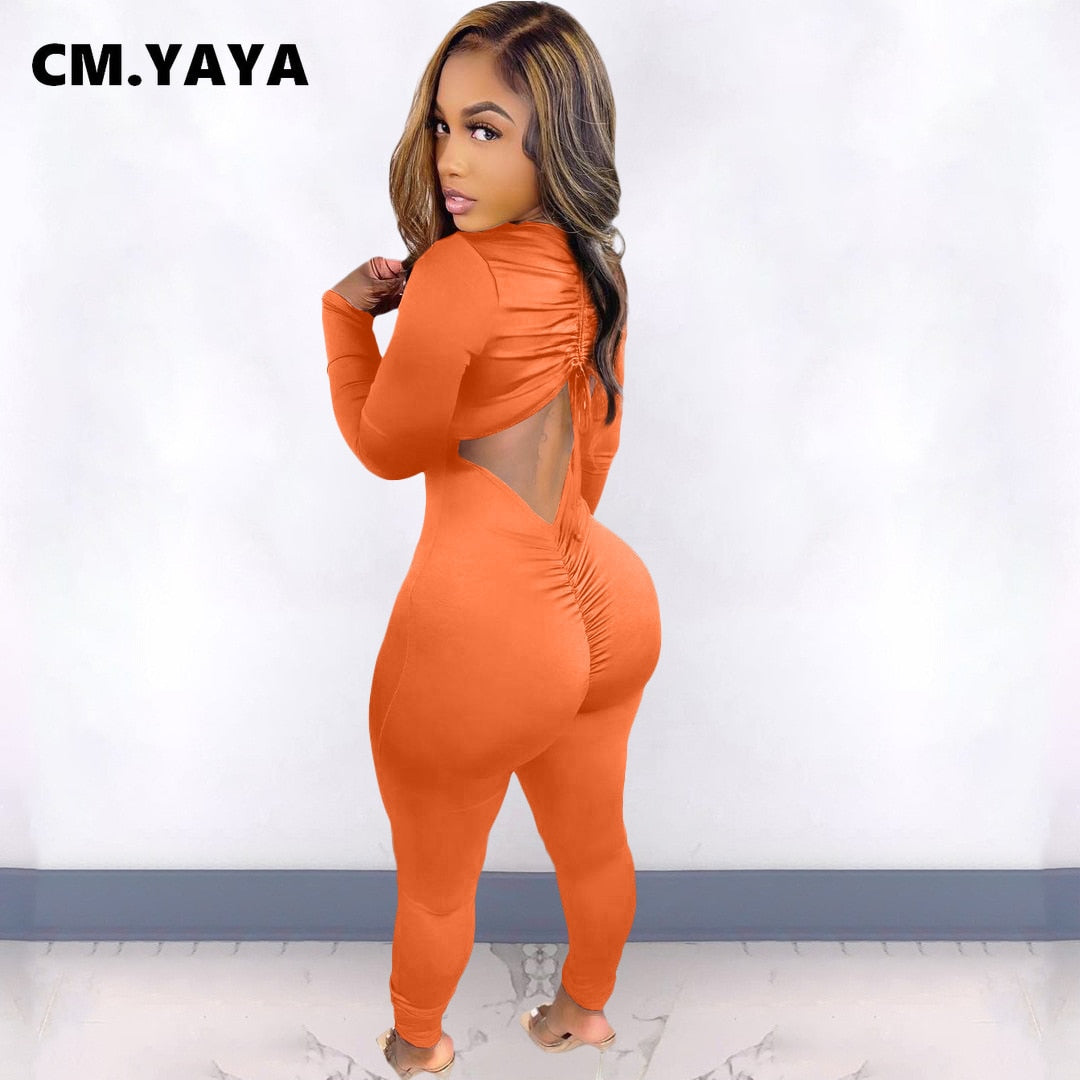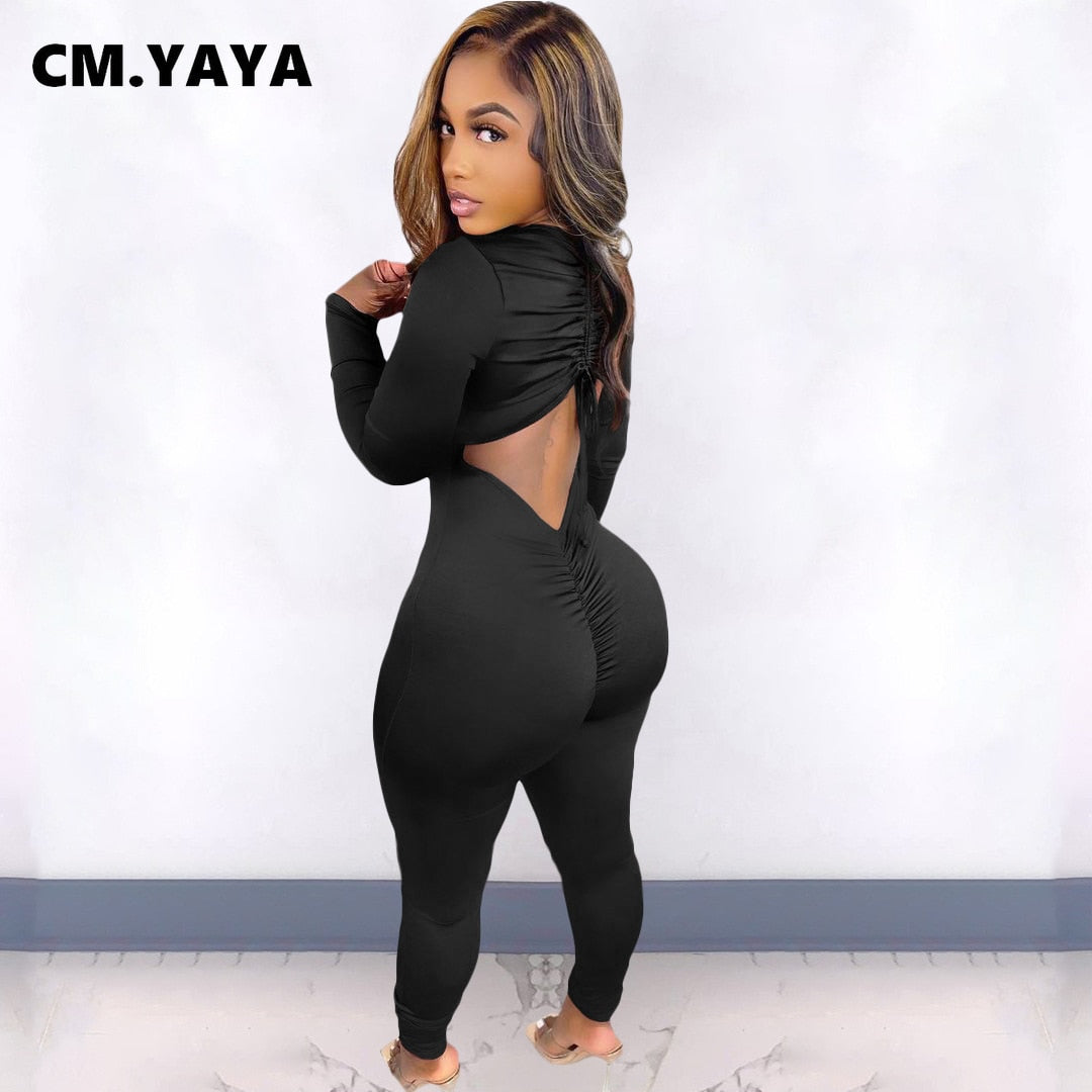 CM.YAYA Women Long Sleeve Ruched Open Back V-neck Jumpsuit Streetwear Sexy Party Solid High Waist One Piece Overall Playsuits