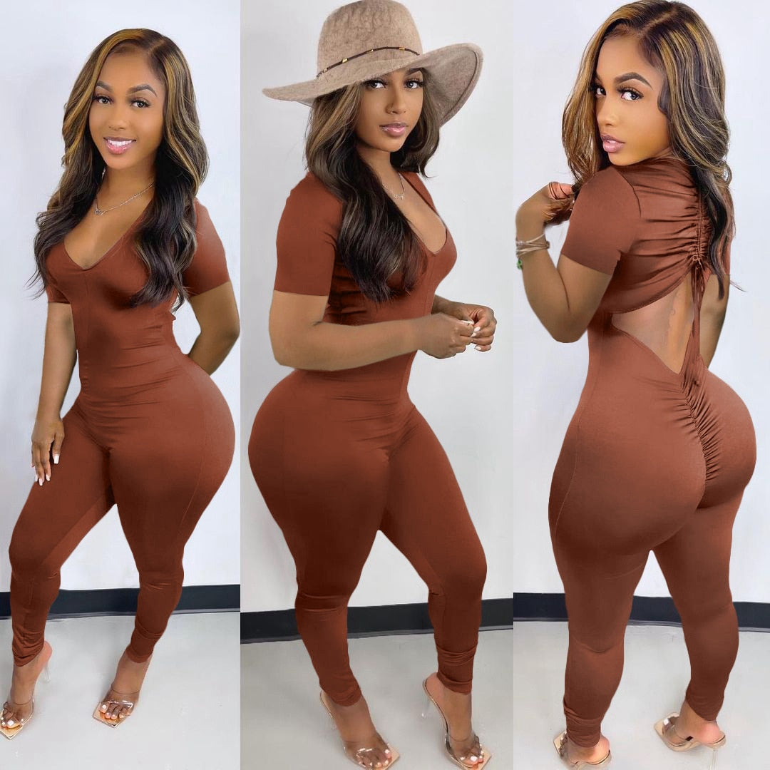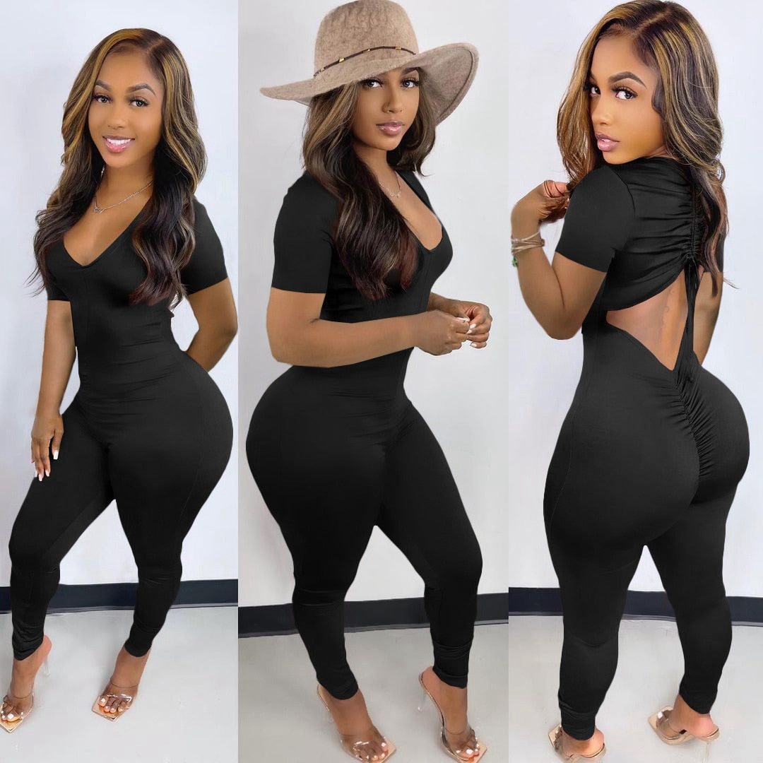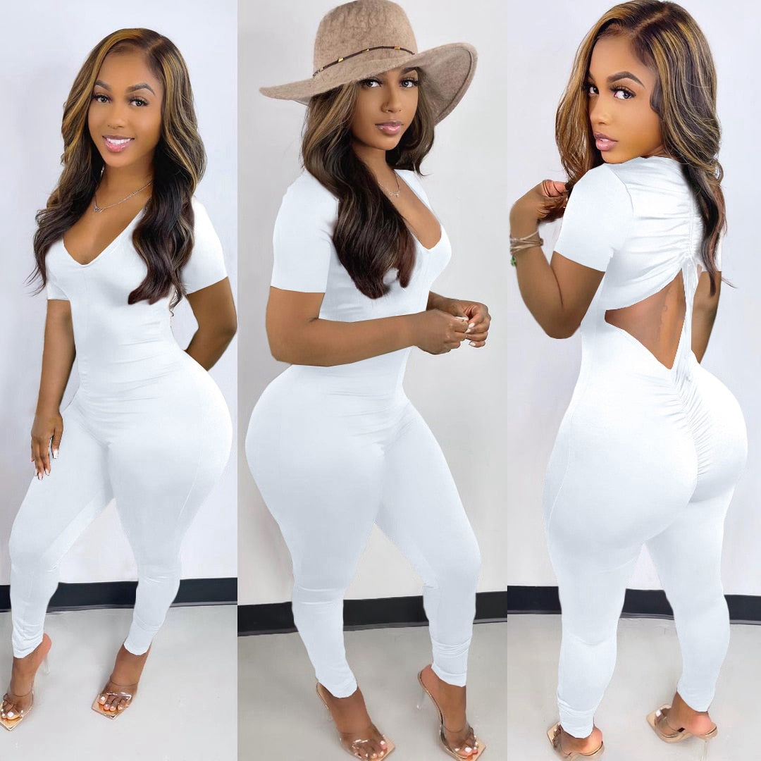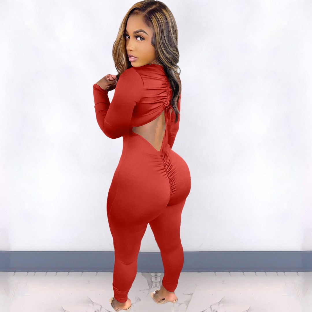 CM.YAYA Women Long Sleeve Ruched Open Back V-neck Jumpsuit Streetwear Sexy Party Solid High Waist One Piece Overall Playsuits