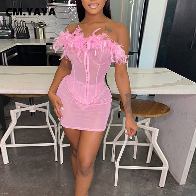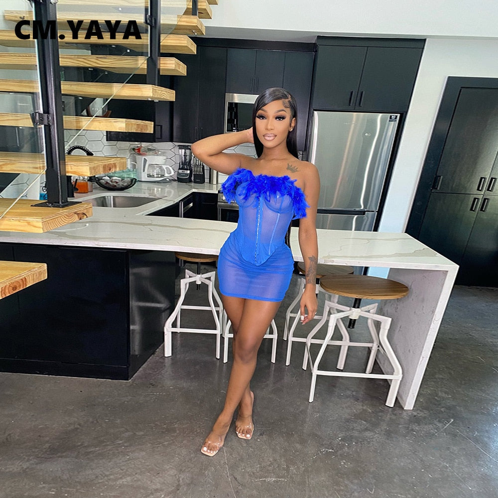 CM.YAYA Women Mesh See Though Mini Midi Skirts Suit and Croset Feather Strapless Shirt Tops Beach Sexy Matching Two 2 Piece Set