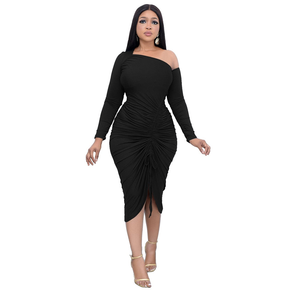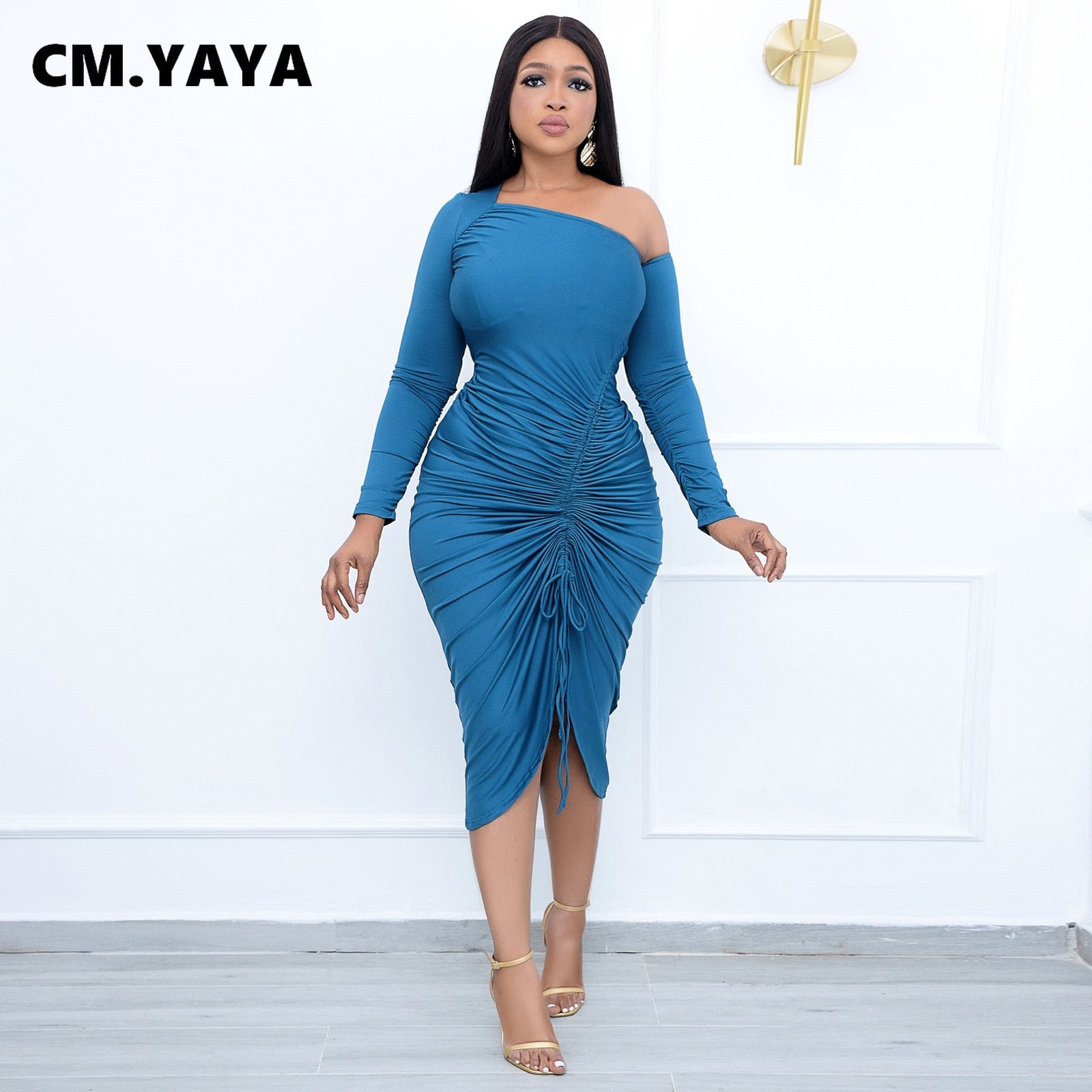 CM.YAYA Women Midi Dress Solid Shirring Splited Pencil Vestidos for Ladies Fashion Party Vestidos Elegance Dresses Autumn 2021