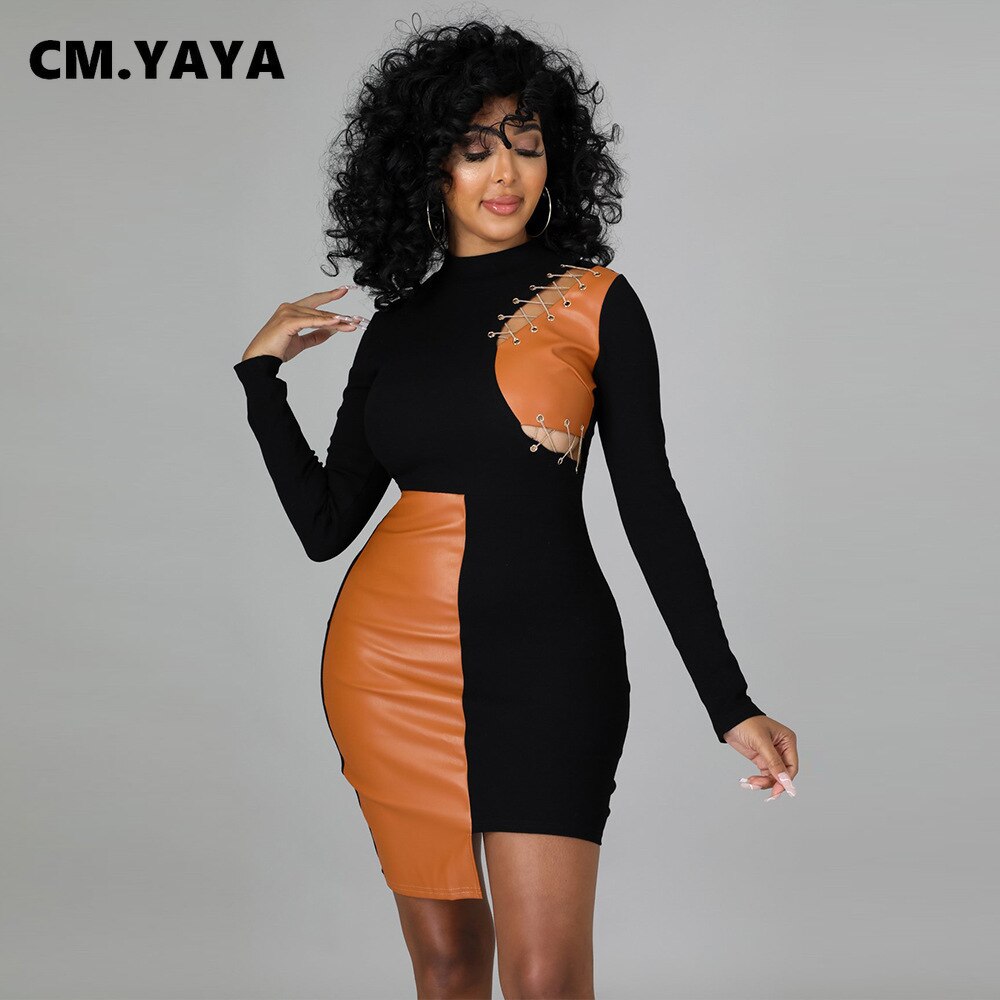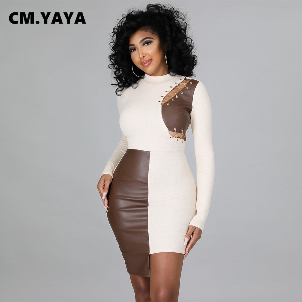 CM.YAYA Women Patchwork Faux Leather Long Sleeve Lace Up Irregular Dress Autumn Sexy Night Party Clubwear Bodycon Midi Dresses