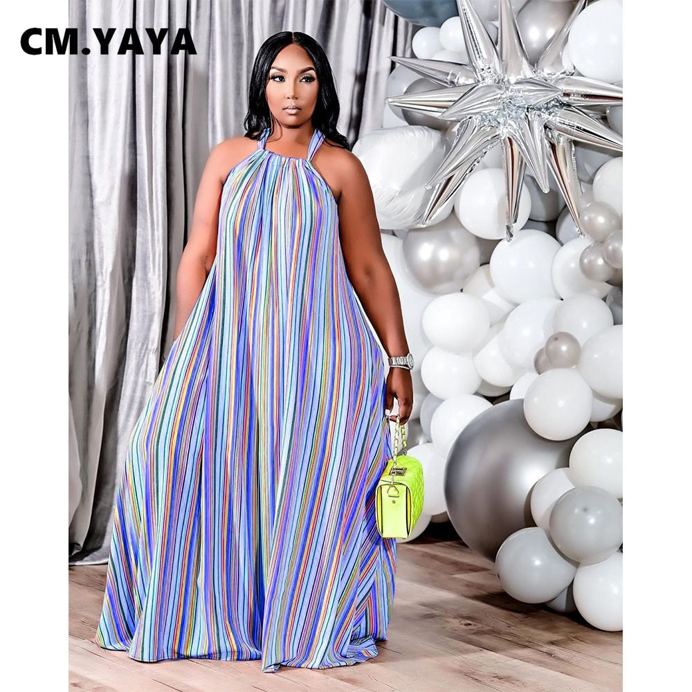 CM.YAYA Women Plus Size Dress O-neck Sleeveless Hater Long Loose Striped Dress Casual Sexy Beach Dress Autumn 2021