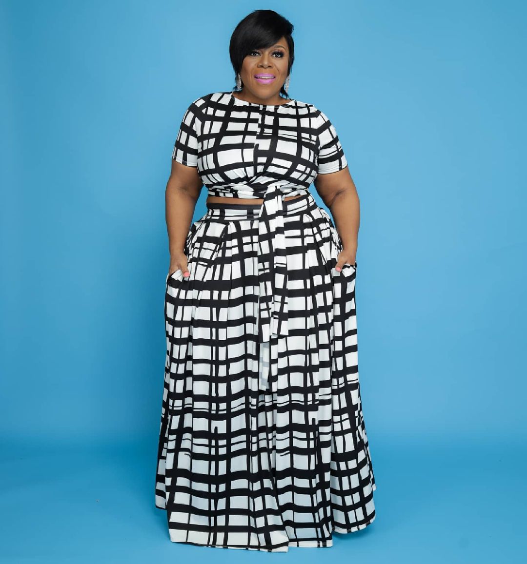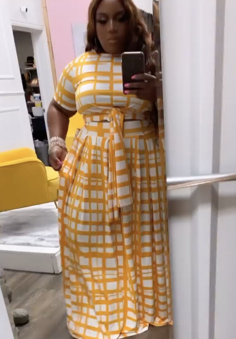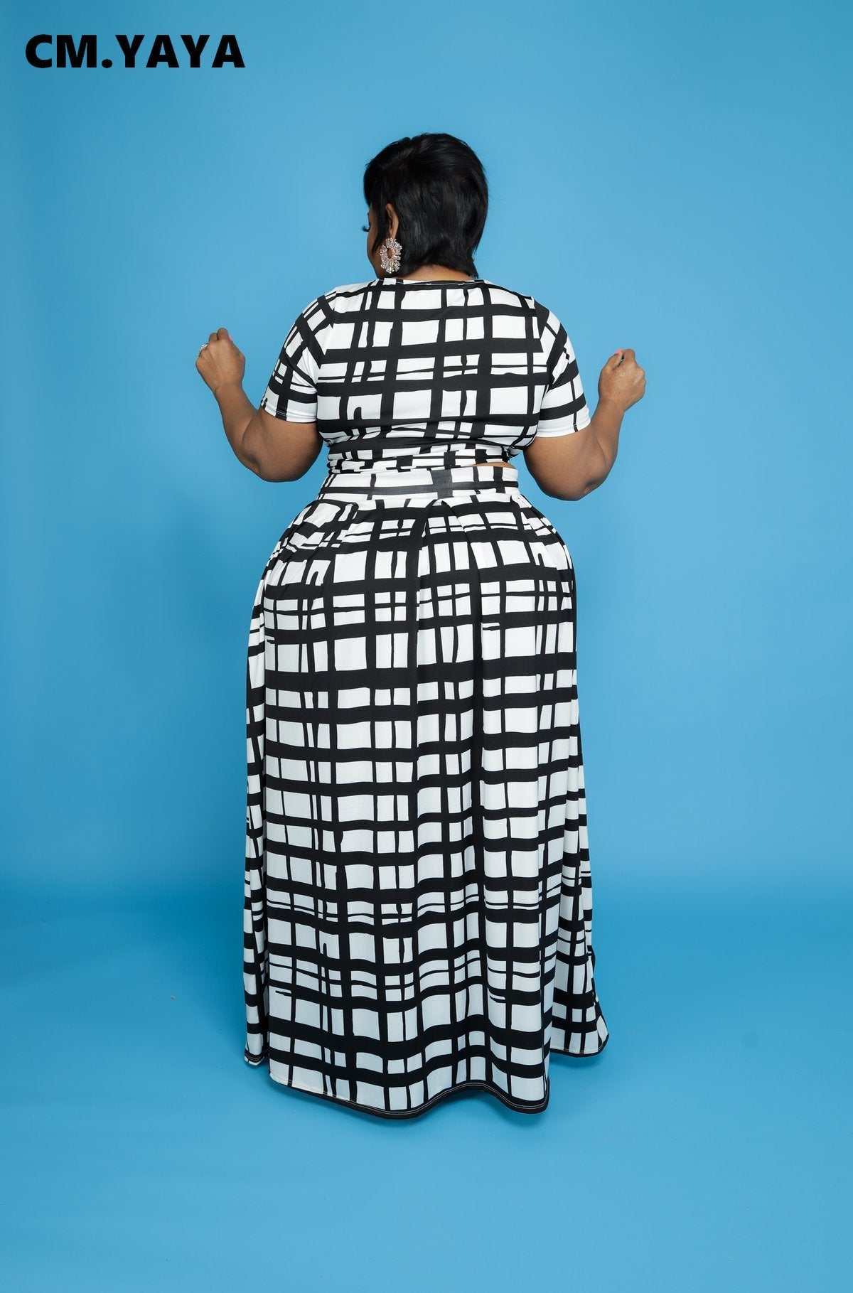 CM.YAYA Women Plus Size Plaid Two Piece Set Fashion Tie Up T-shirt and Maxi Skirts Matching Set Streetwear Vintage Outfits