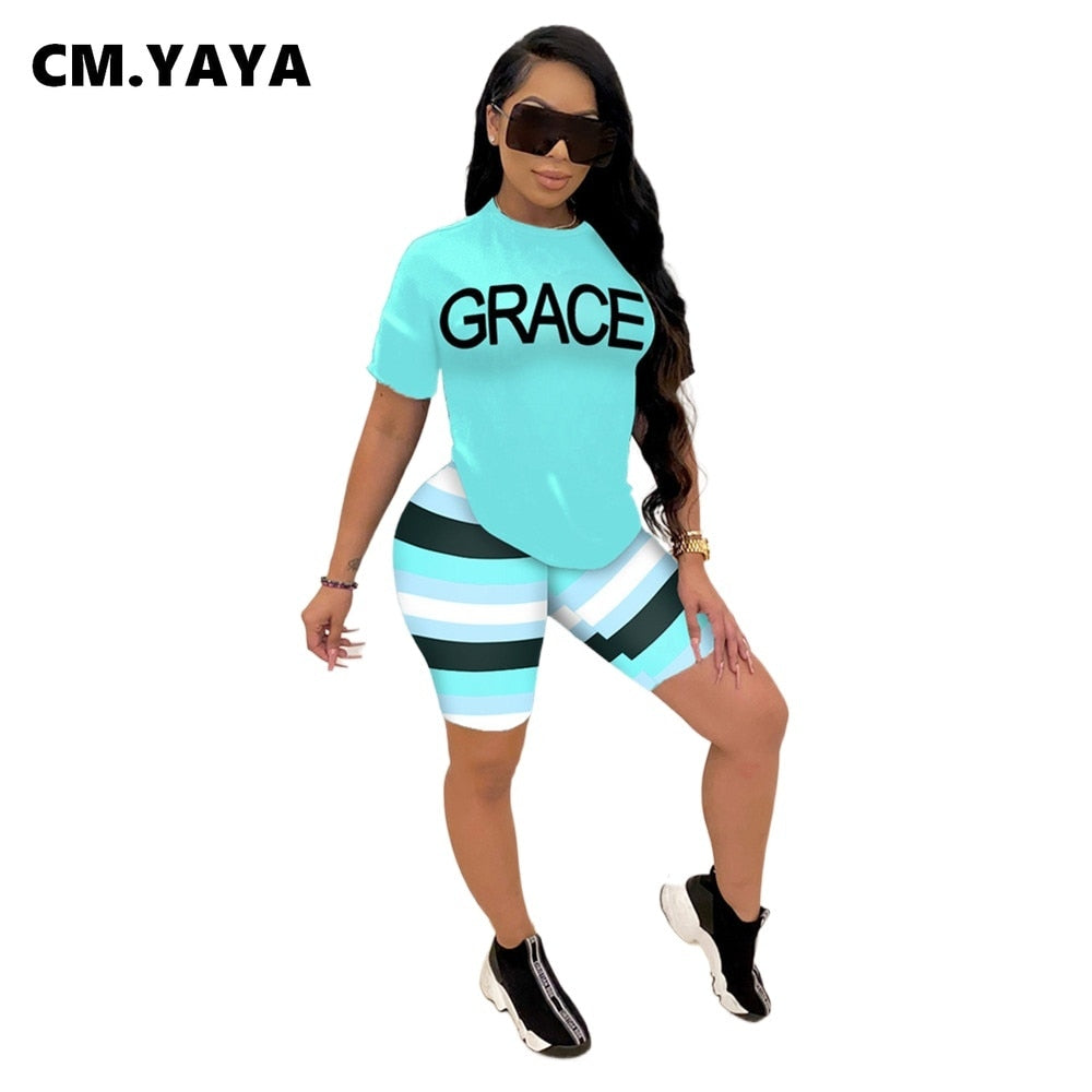 CM.YAYA Women Set Letter Print Short Sleeve O-neck Tops Striped Shorts Two 2 Piece Sets Active Tracksuit Summer Outfits 2021