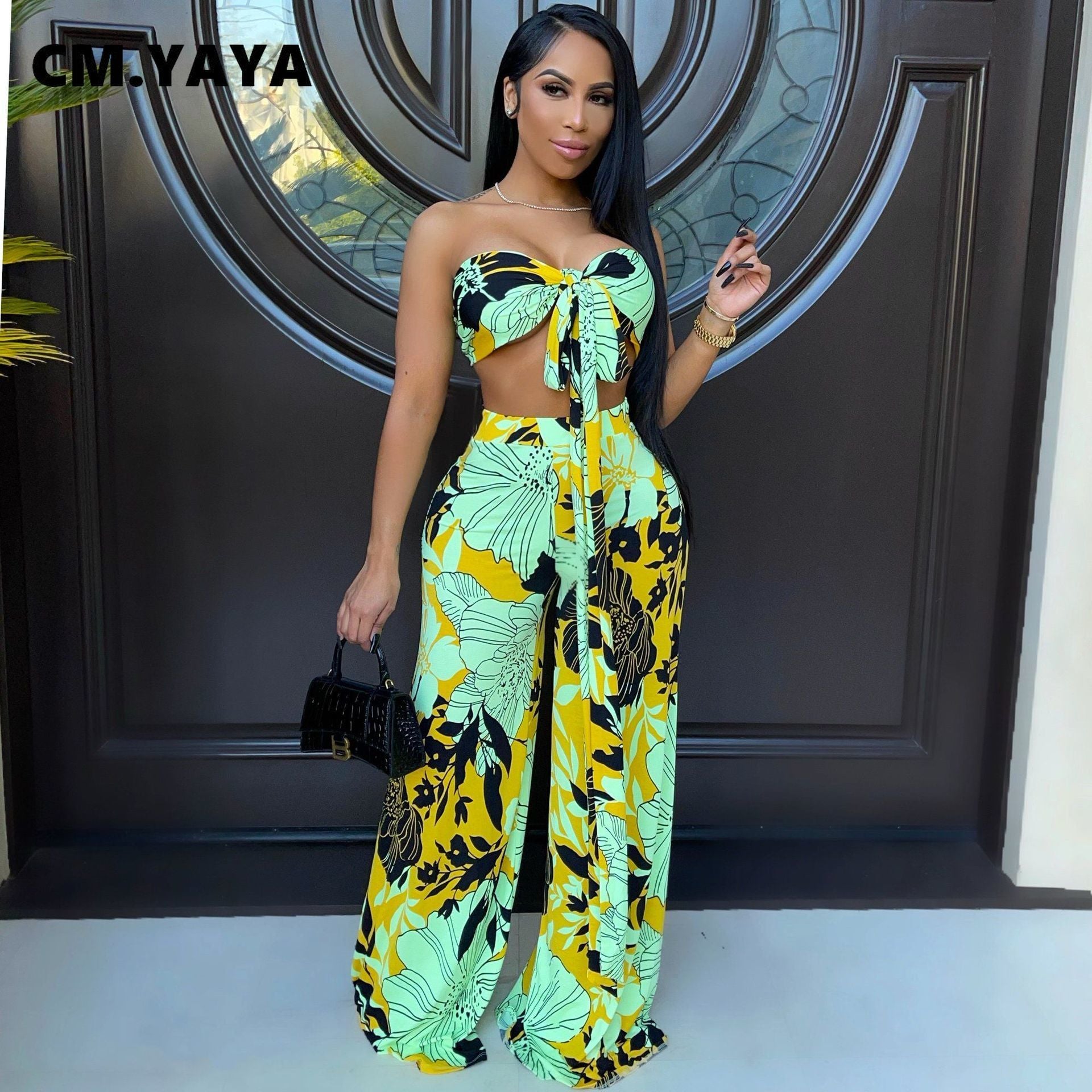 CM.YAYA Women Set Print Sleeveless Strapless Bandage Crop Tops Wide Leg Pants 2 Two Piece Sets Casual Fashion Streetwear Summer