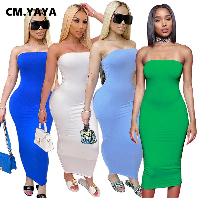 CM.YAYA Women Summer Long Maxi Dress Strapless Stretch Beach Bodycon Bandage Night Clubwear Solid Dresses Vestidos
