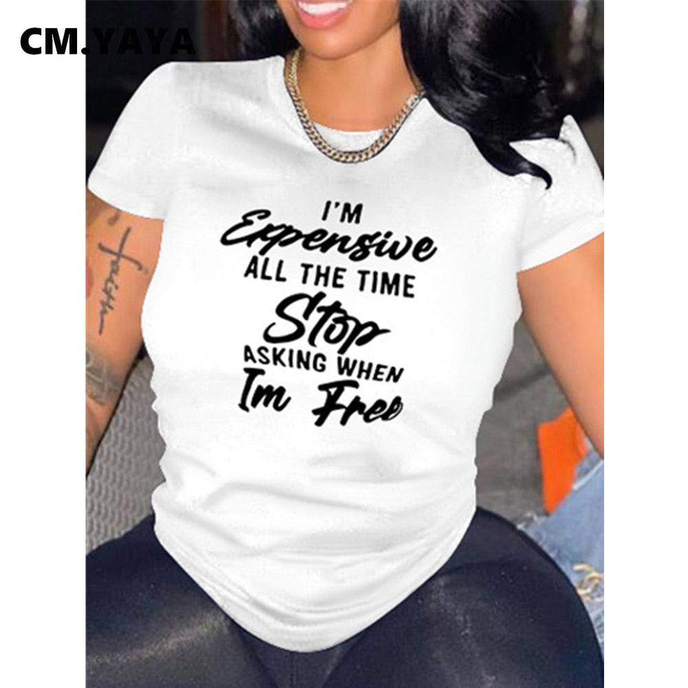CM.YAYA Women T-shirts Letter Print Short Sleeve O-neck Stretchy T Shirt Tops Female Fashion Streetwear Casual Tees Tops Summer