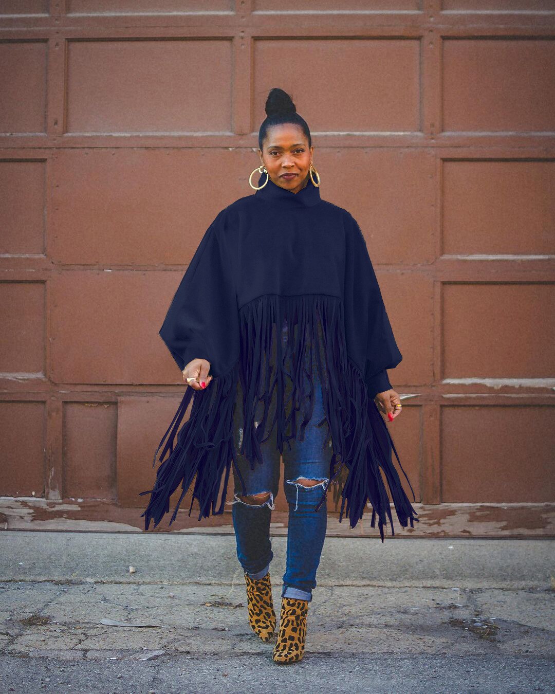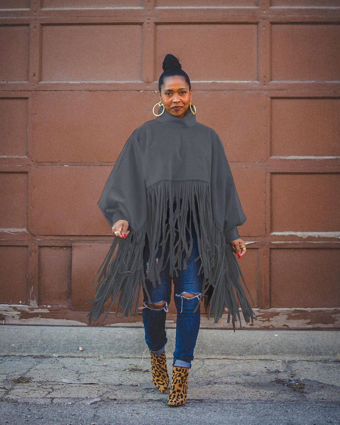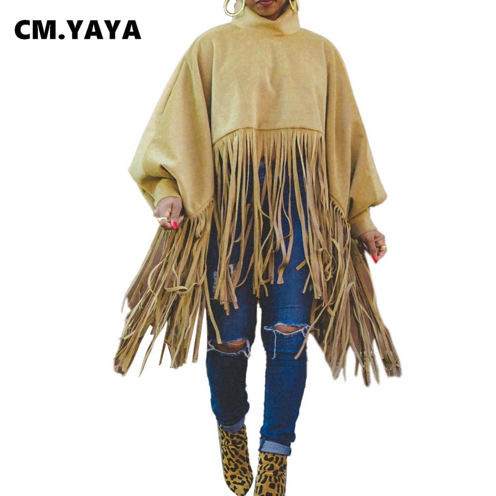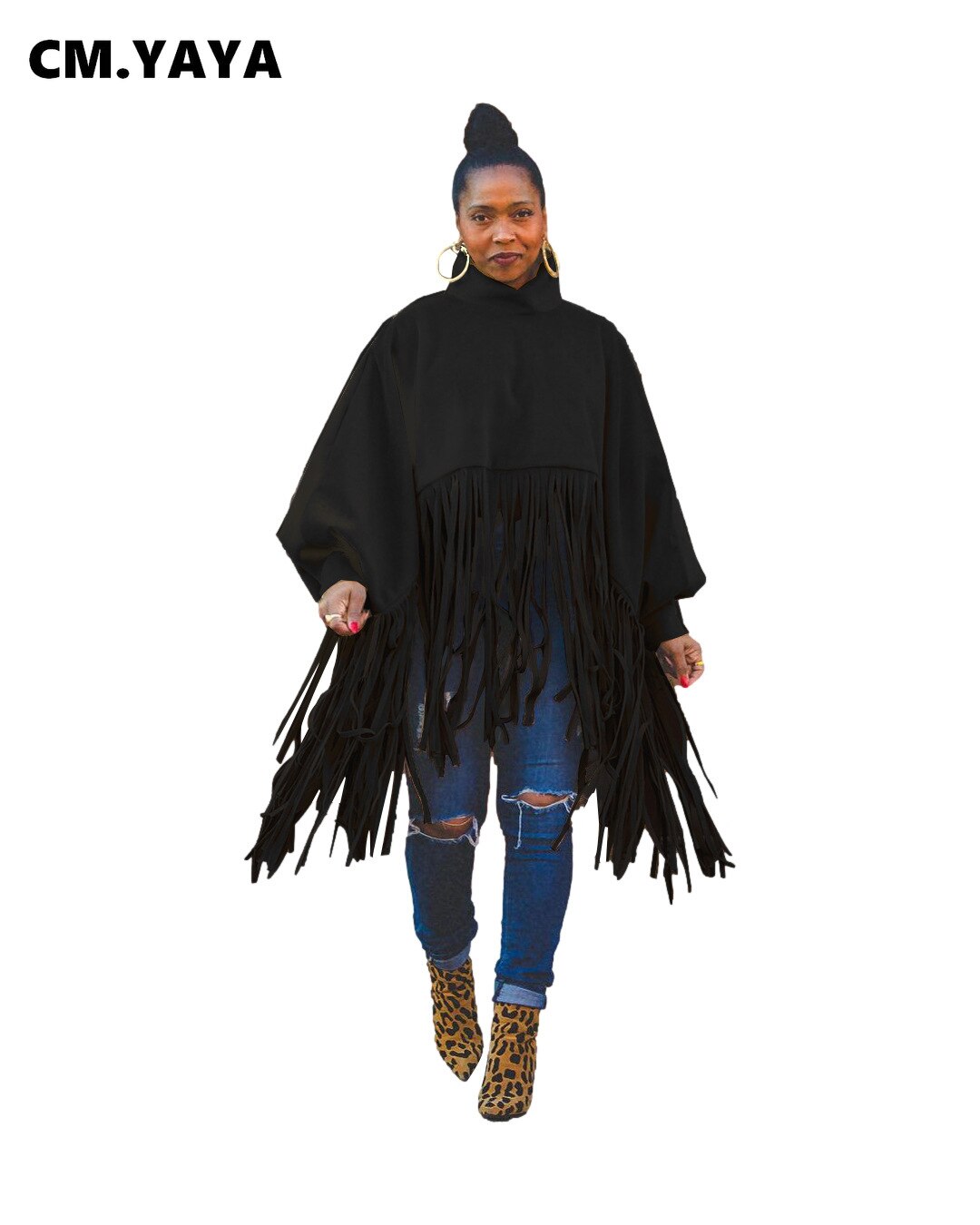CM.YAYA Women Tassel Hem Batwing Sleeve Capes & Ponchos Streetwear Basic Elegant Turtleneck Autumn Winter INS Tops