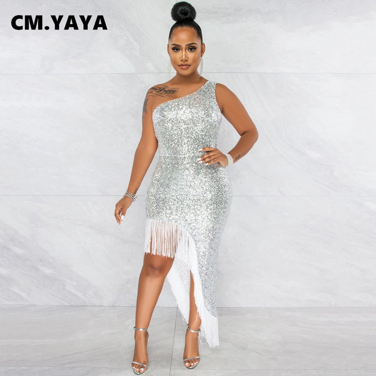 CM.YAYA Women Tassel Side Sequins One Shoulder Skew Neck Bodycon Midi Maix Irregular High Low Long Dress Sexy Night Party