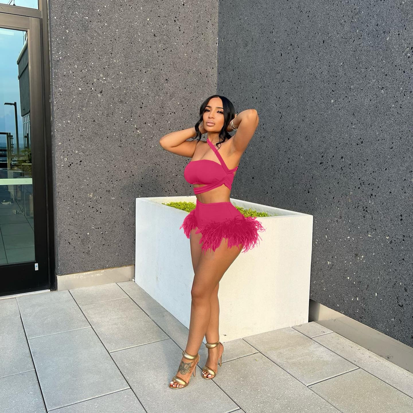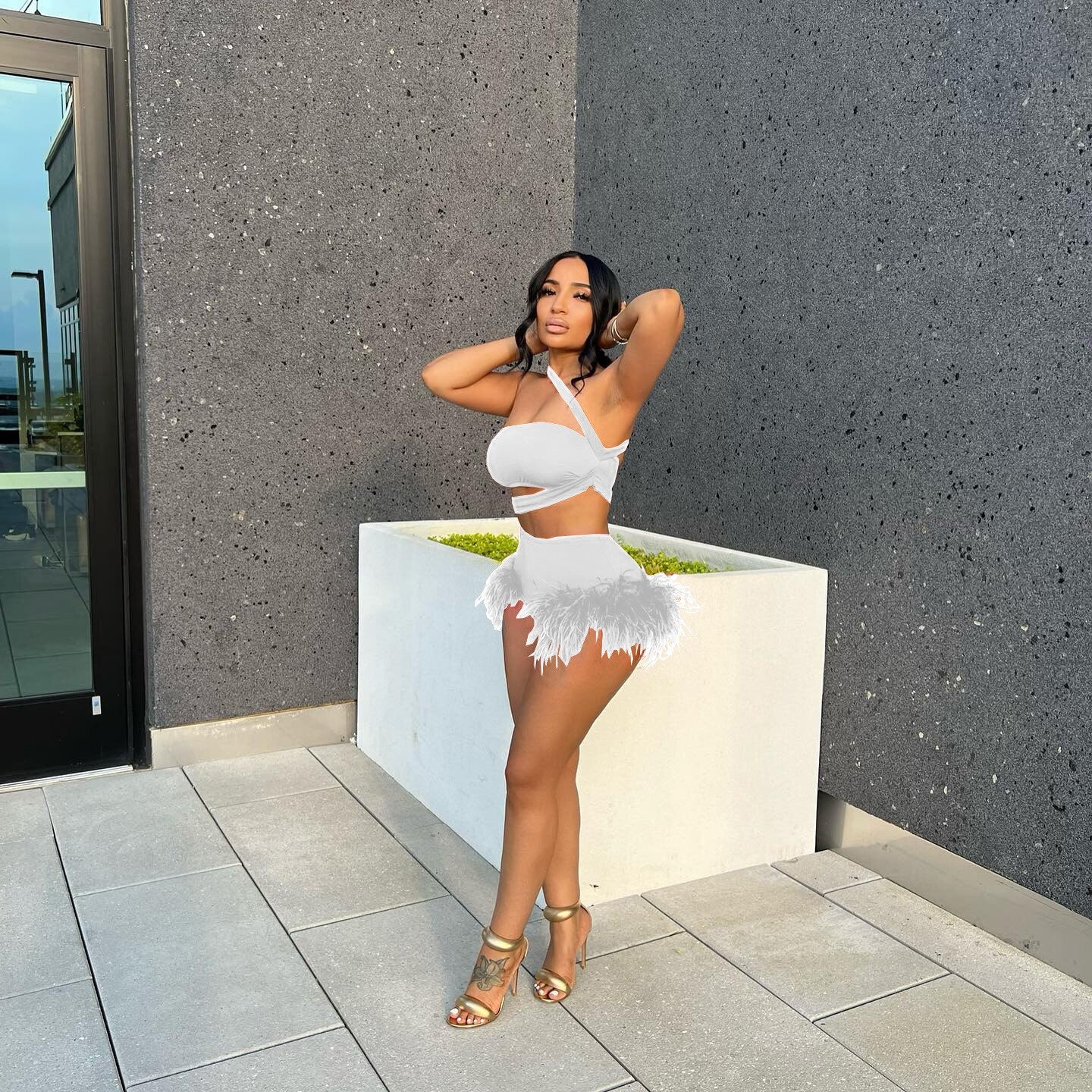 CM.YAYA Workout Women Two 2 Piece Set Outfits Sweatsuit 2022 Summer Mini Tank and Feather Shorts Sexy Matching Set Tracksuit
