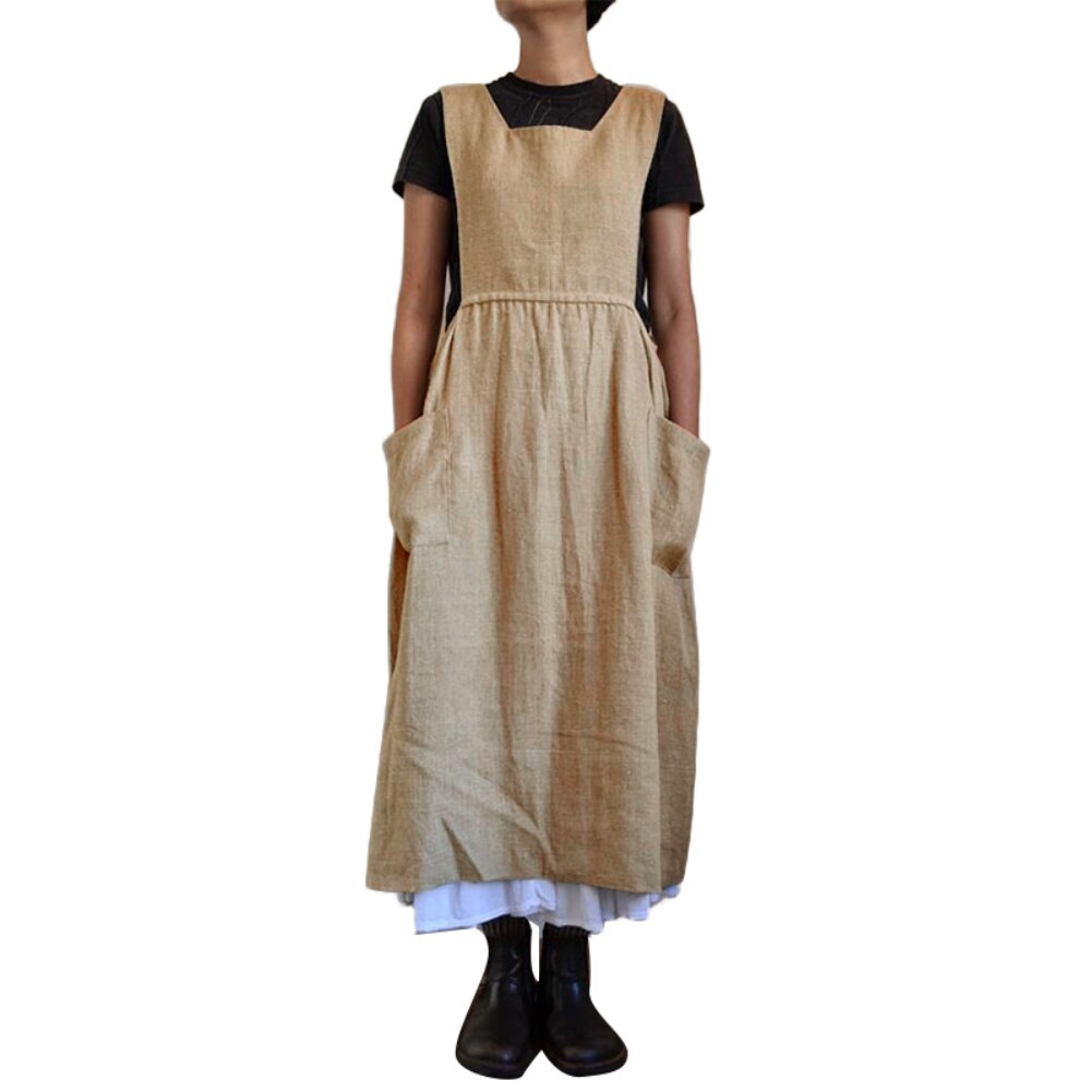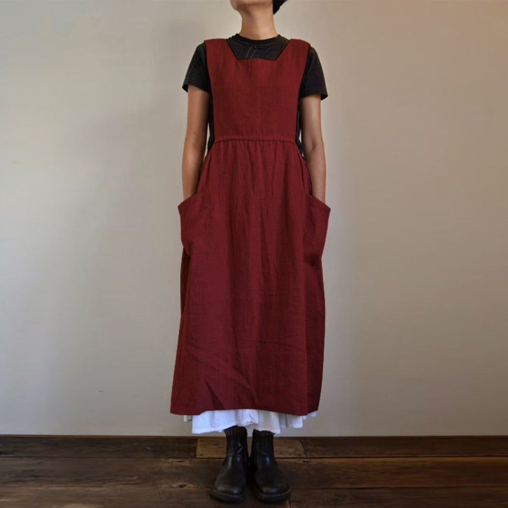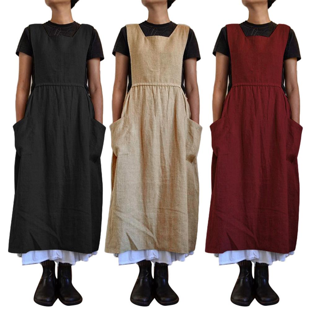 Dresses for Women 2021 Solid Color Sleeveless Square Neck Pockets Cotton Linen Apron Loose Long Dress Casual Overalls