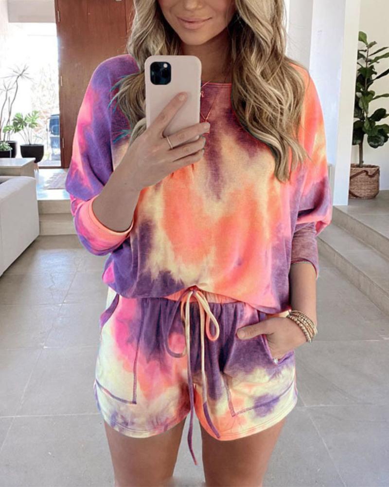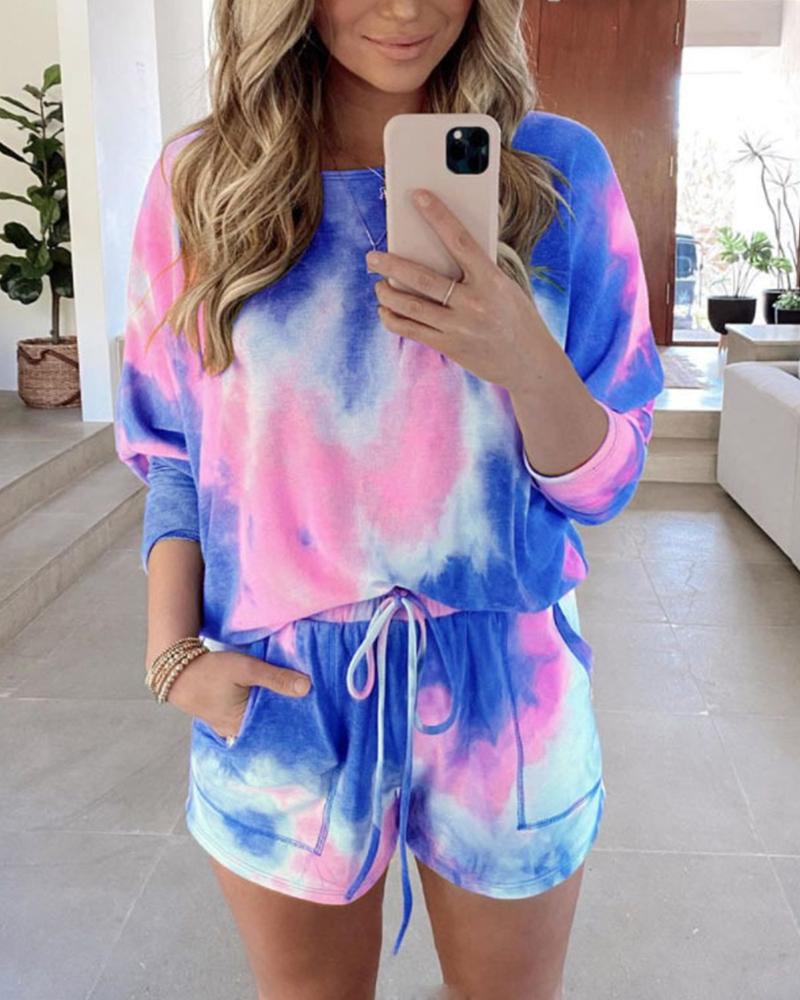 hirigin New Tie Dye Colorful 2Pieces Sets Women Tracksuits Casual Long Sleeve Pullovers Lace Up Shorts with Pockets Outfits