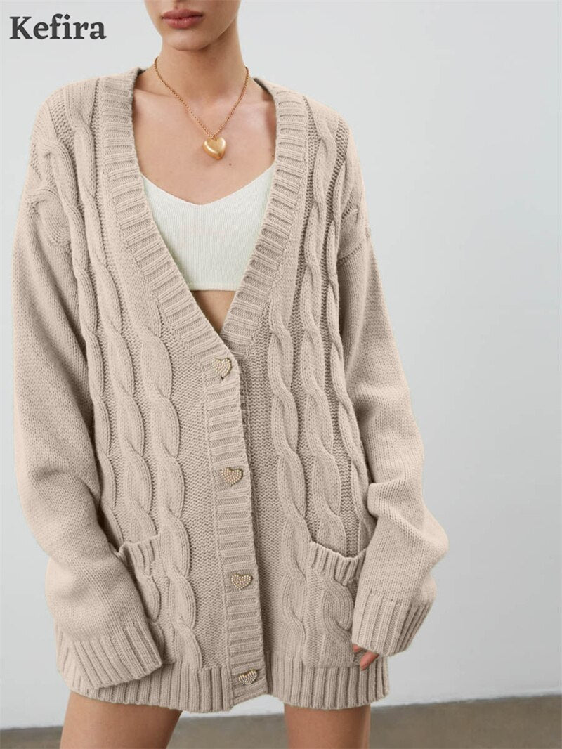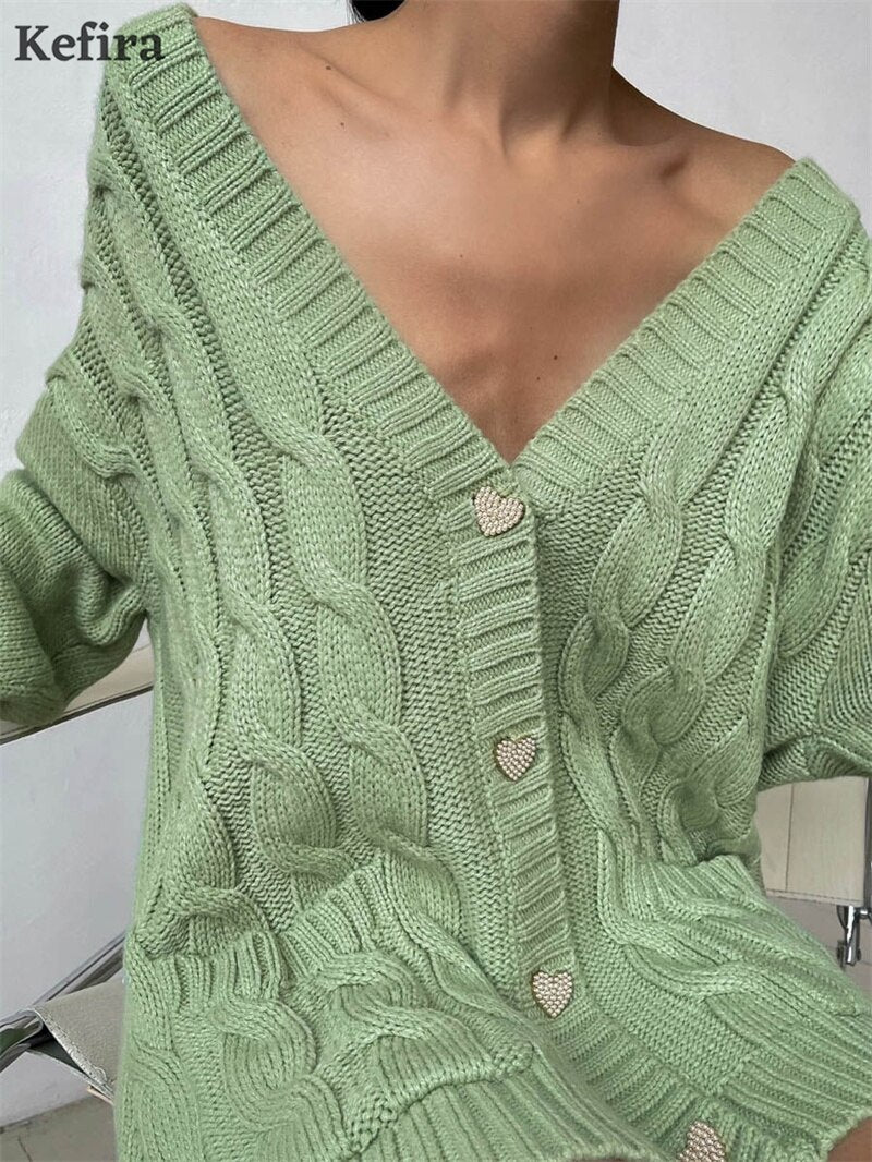 Kefira 2021 V Neck Cardigan For Women Knitted Long Sleeve Sweater Oversize Cardigan Autumn Winter Button Loose Casual Jumper